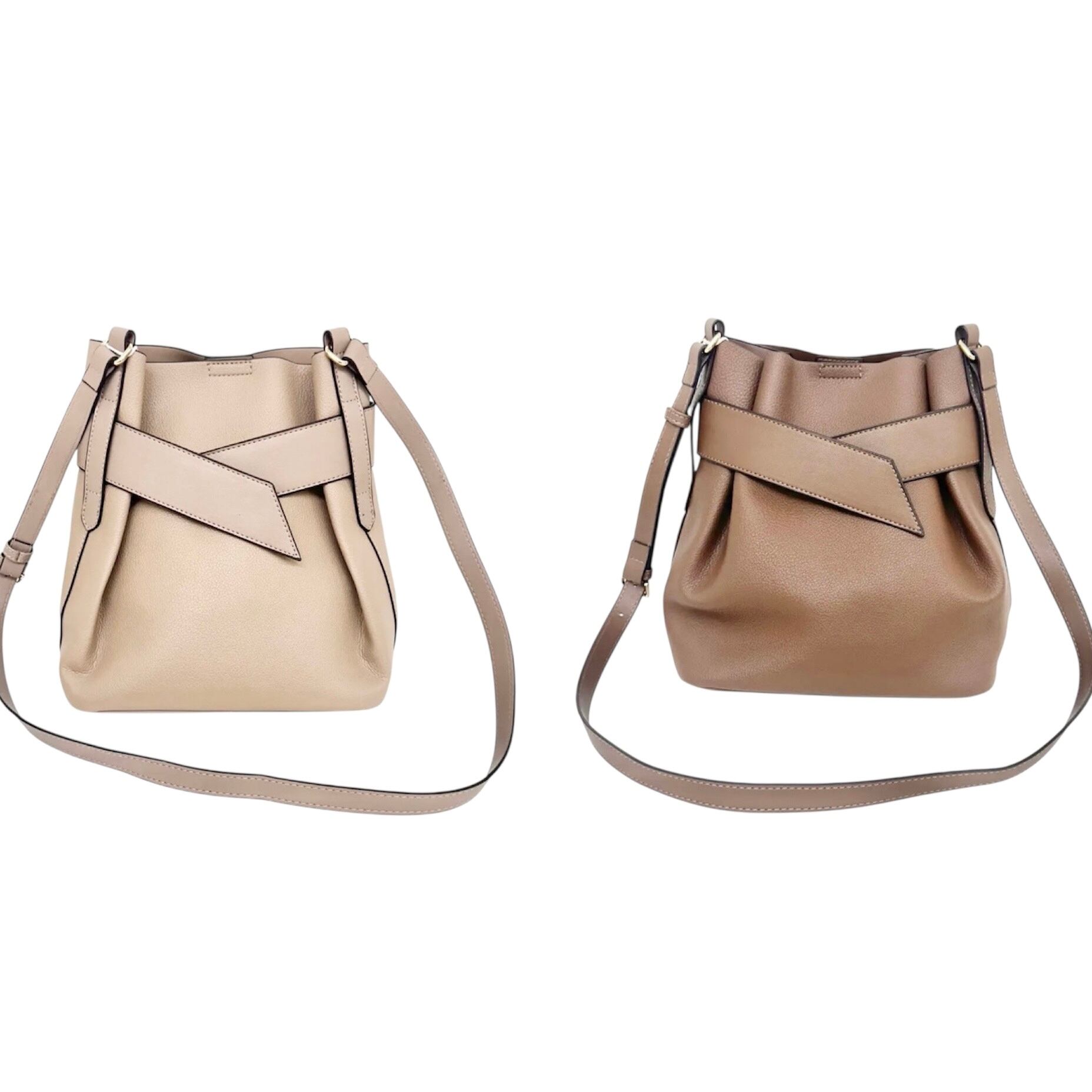 質感が良いフェイク レザーの巾着タイプのショルダー バッグ。