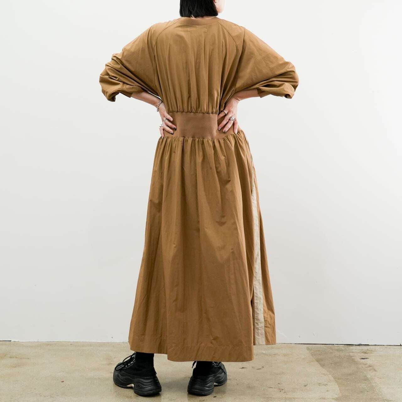 ハリのあるナイロン素材が程よいボリューム感を生み、さらっと纏うだけでスタイリングが決まる一着。身体のラインを拾わないシルエットで、ウエストのリブ切り替えで自然なメリハリをプラス。