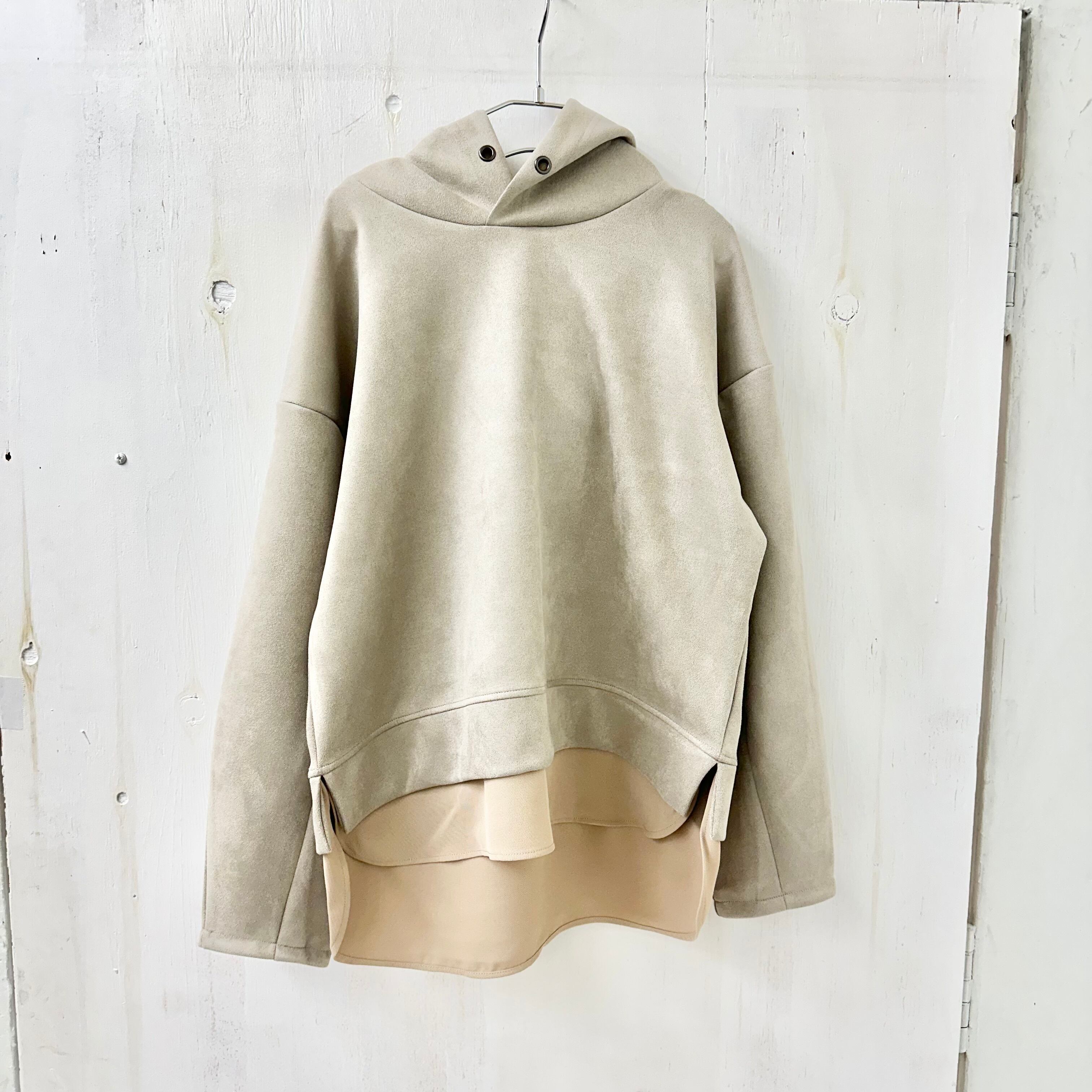 裾にブラウスのレイヤード風ドッキングデザインの緩いシルエットのパーカーに