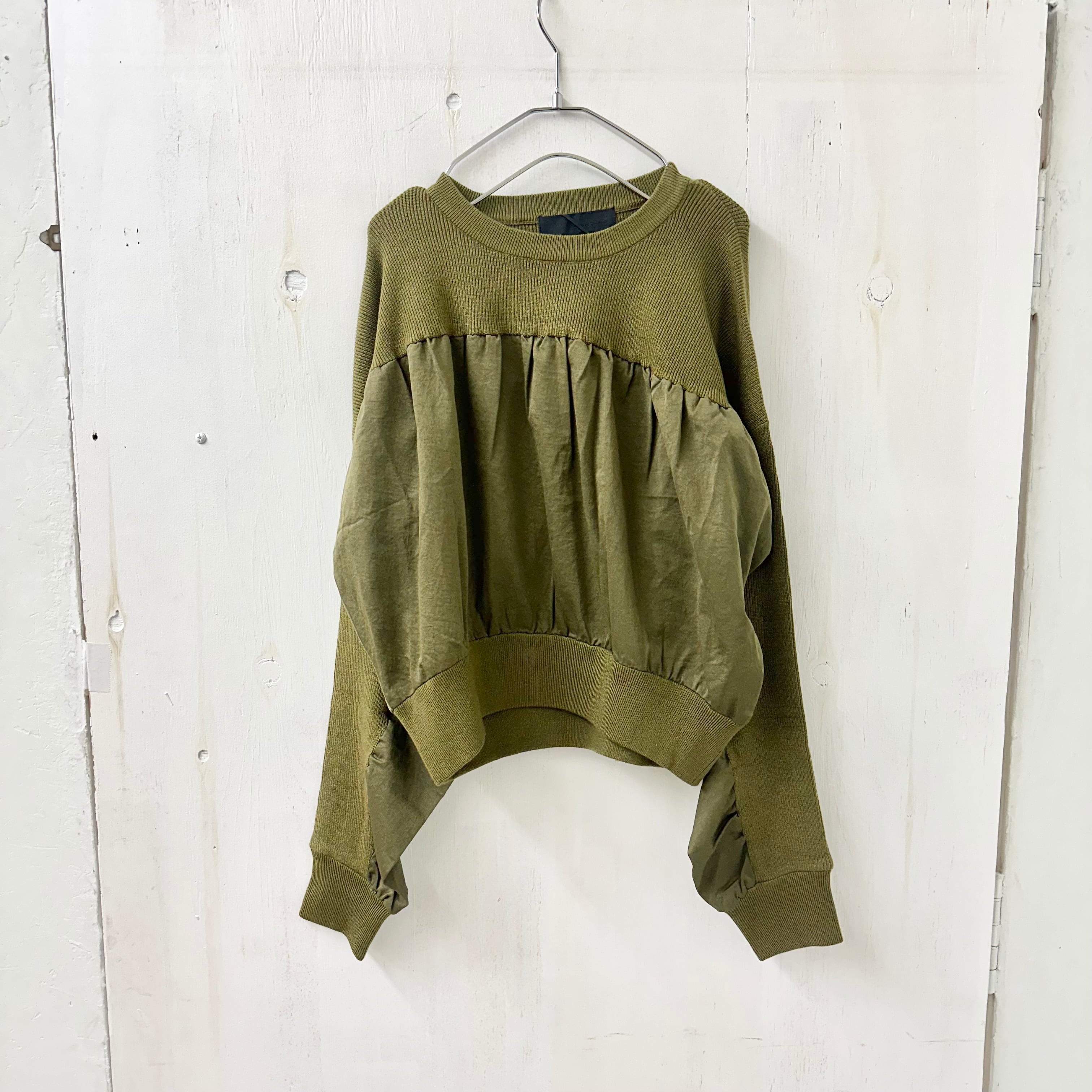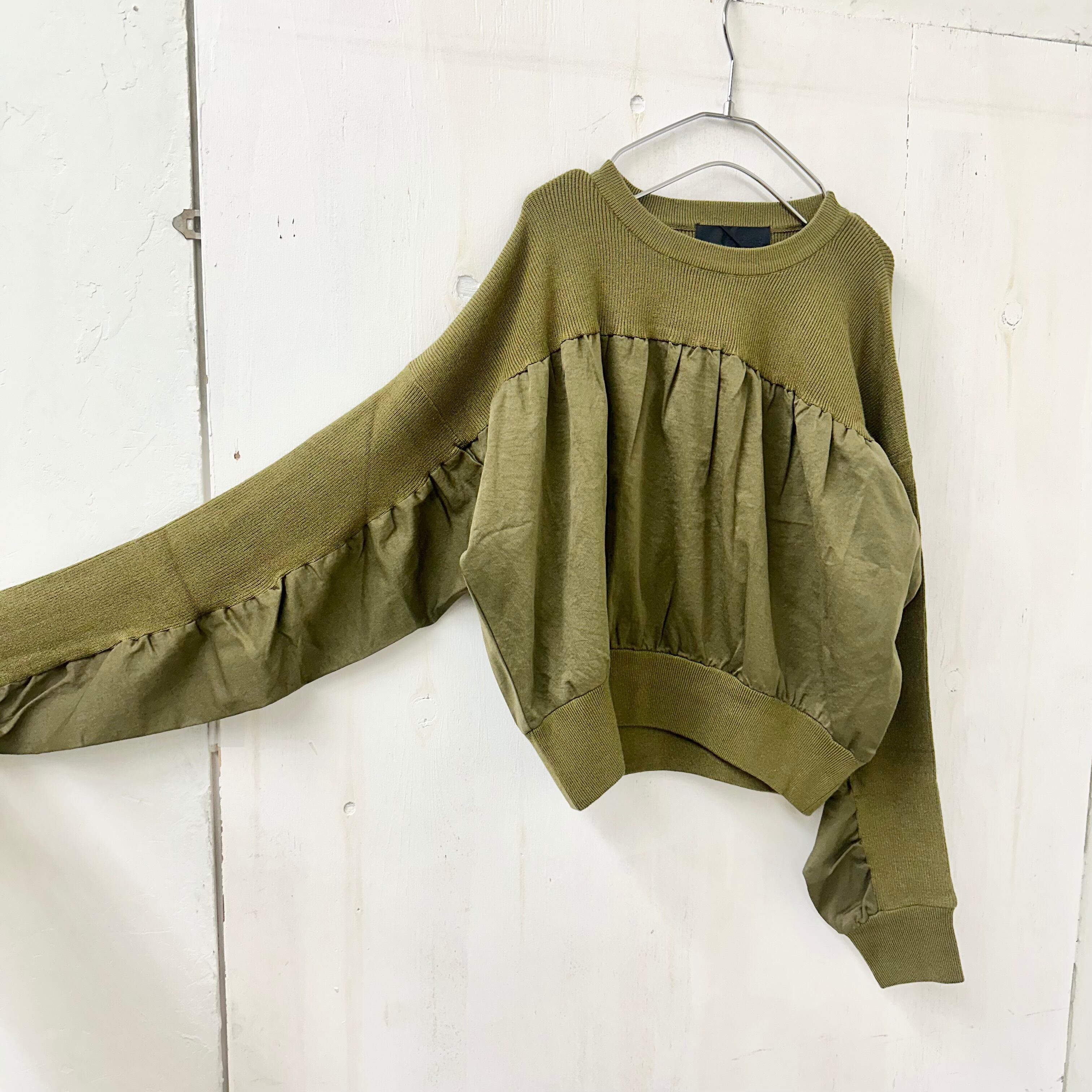 身頃に鈍い光沢感のあるブラウスをドッキングしたショート ニット プルオーバーが登場。
