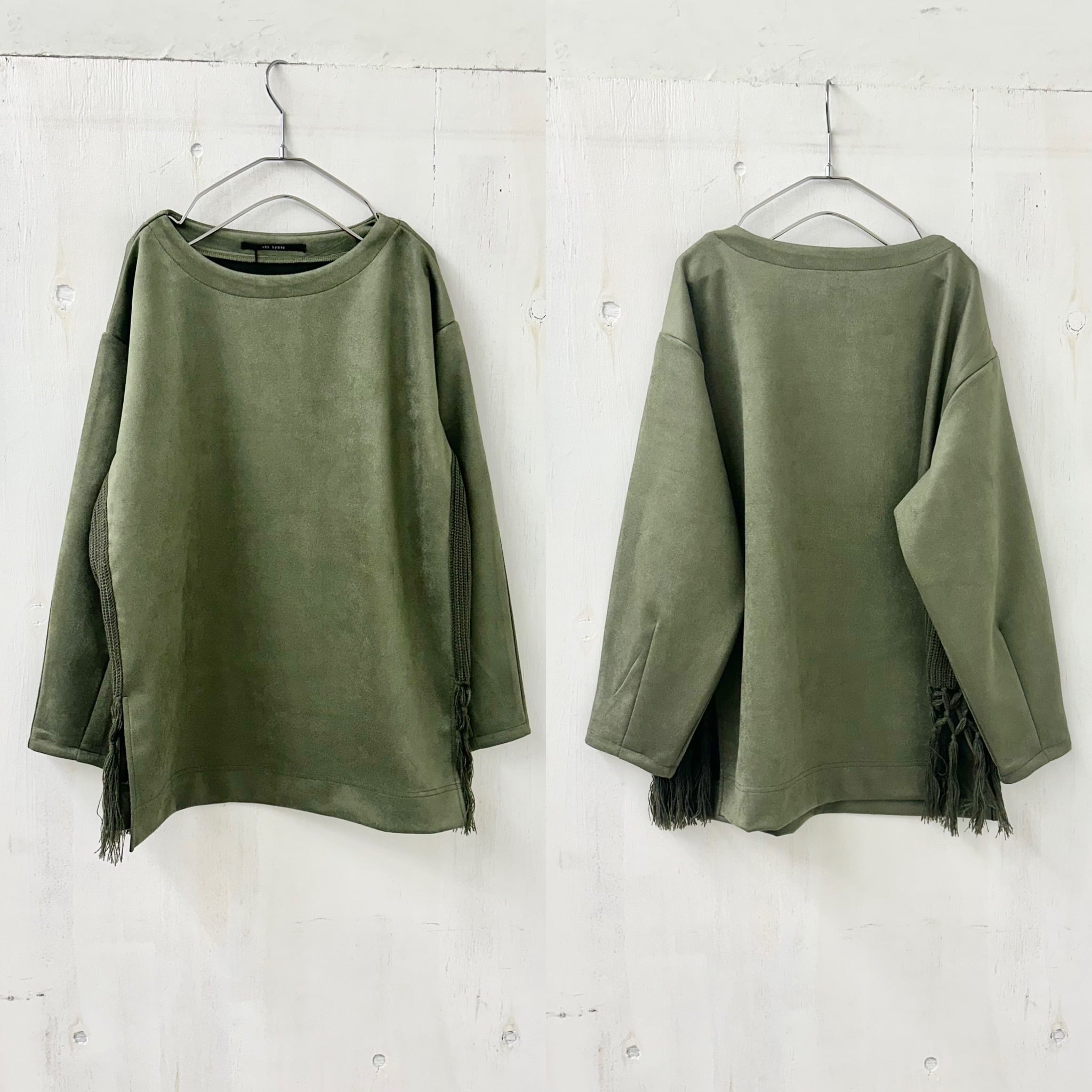 ディア スキン ダンボール フリンジ ニット切替 クルーネック x スリット パンツ SET UP