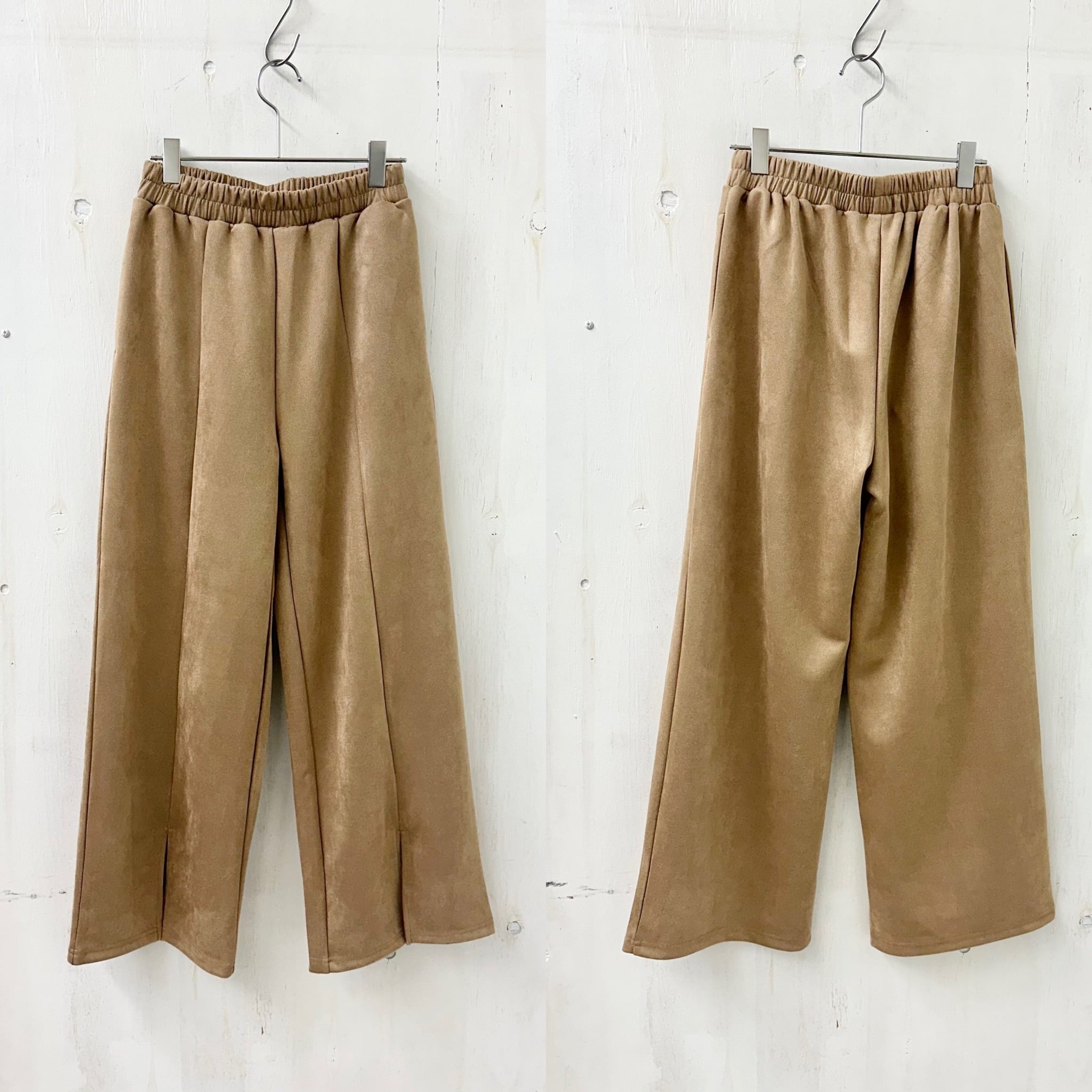サイドのニット切替にフリンジ、裾スリット入りパンツ。