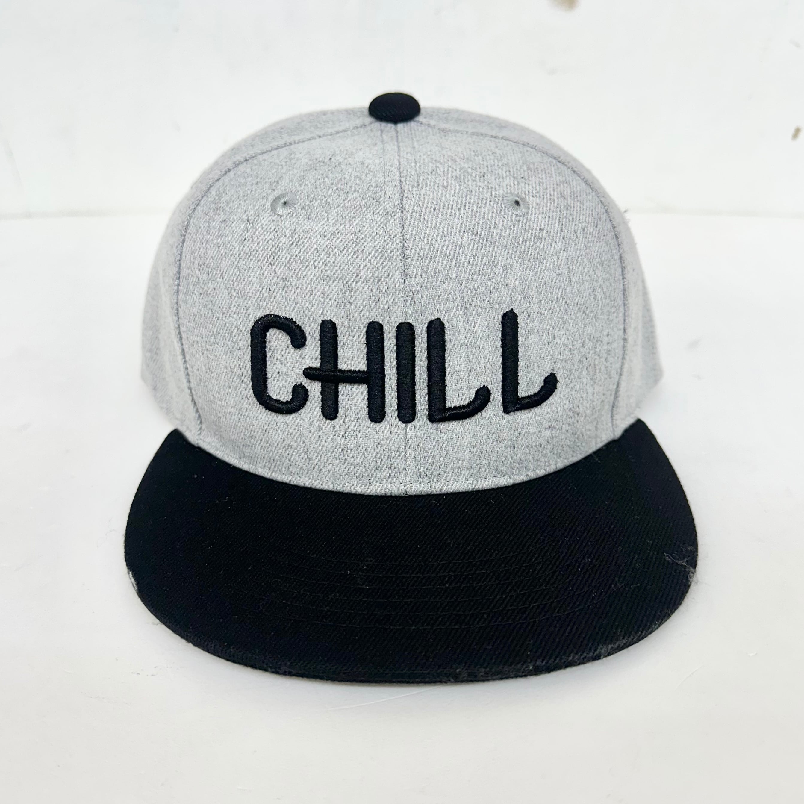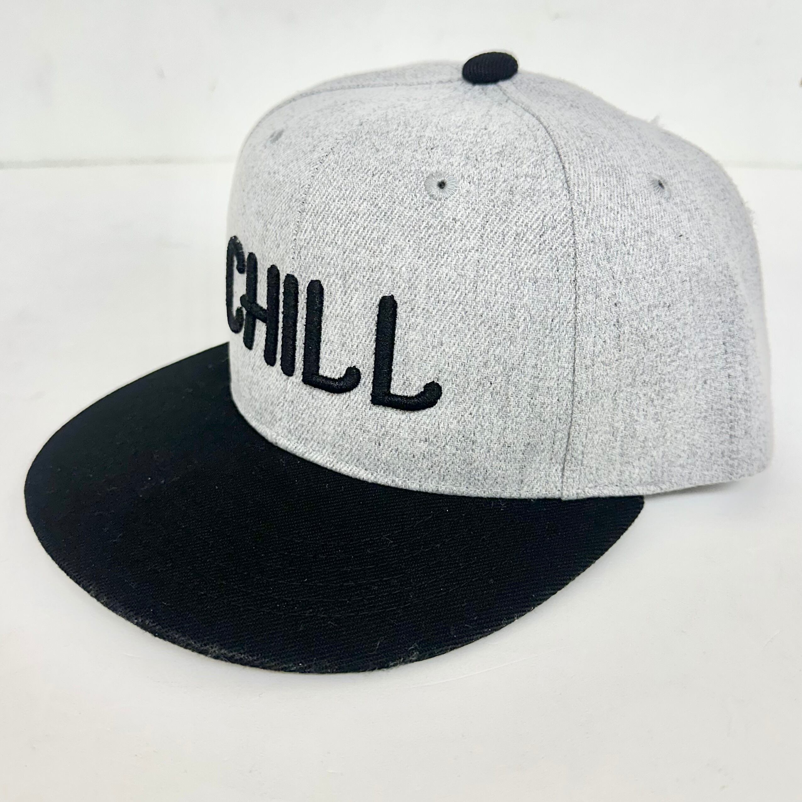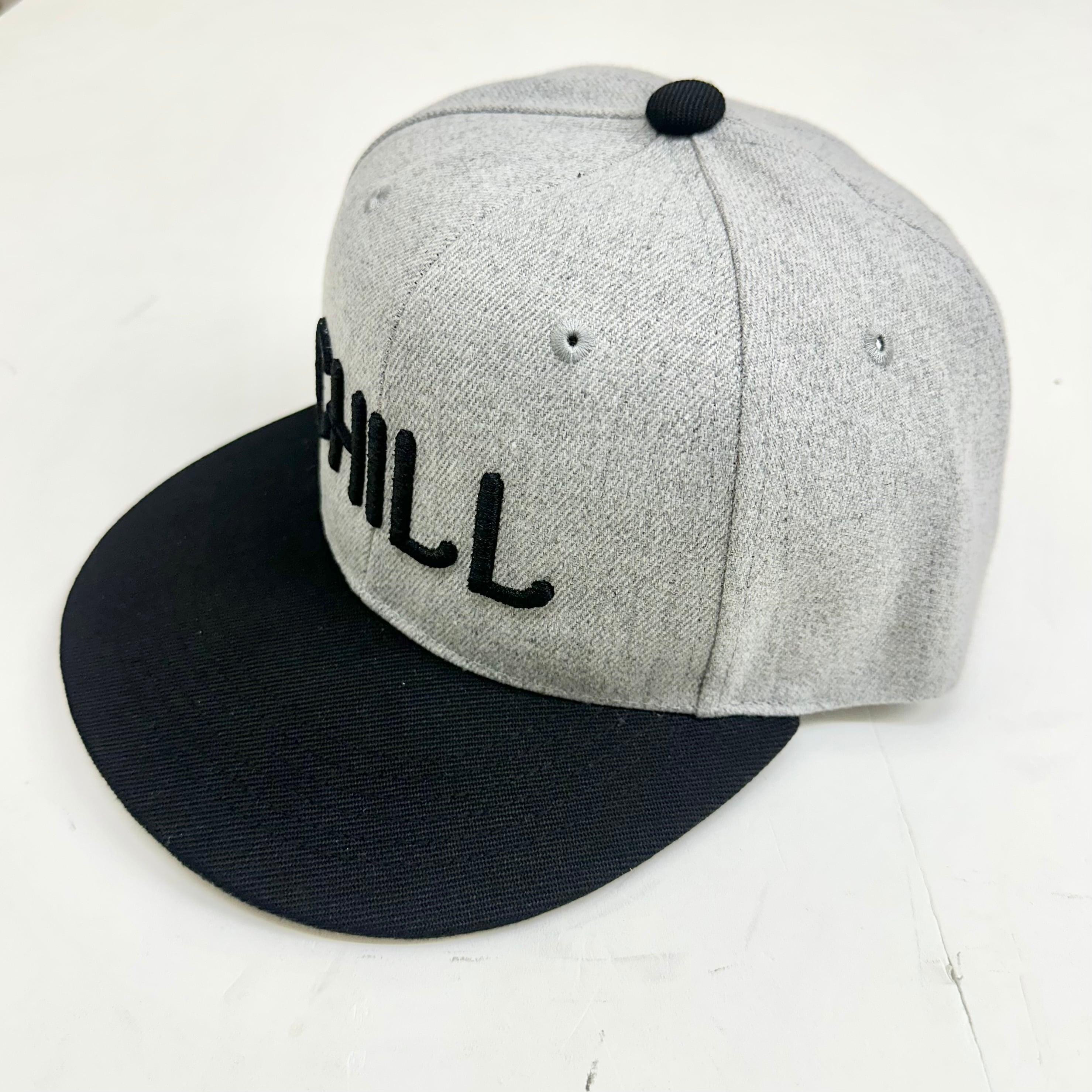 【STRIPE BALLOON】バイカラー フラット バイザー スナップ CAP 『CHILL』3D刺繍 グレーXブラック