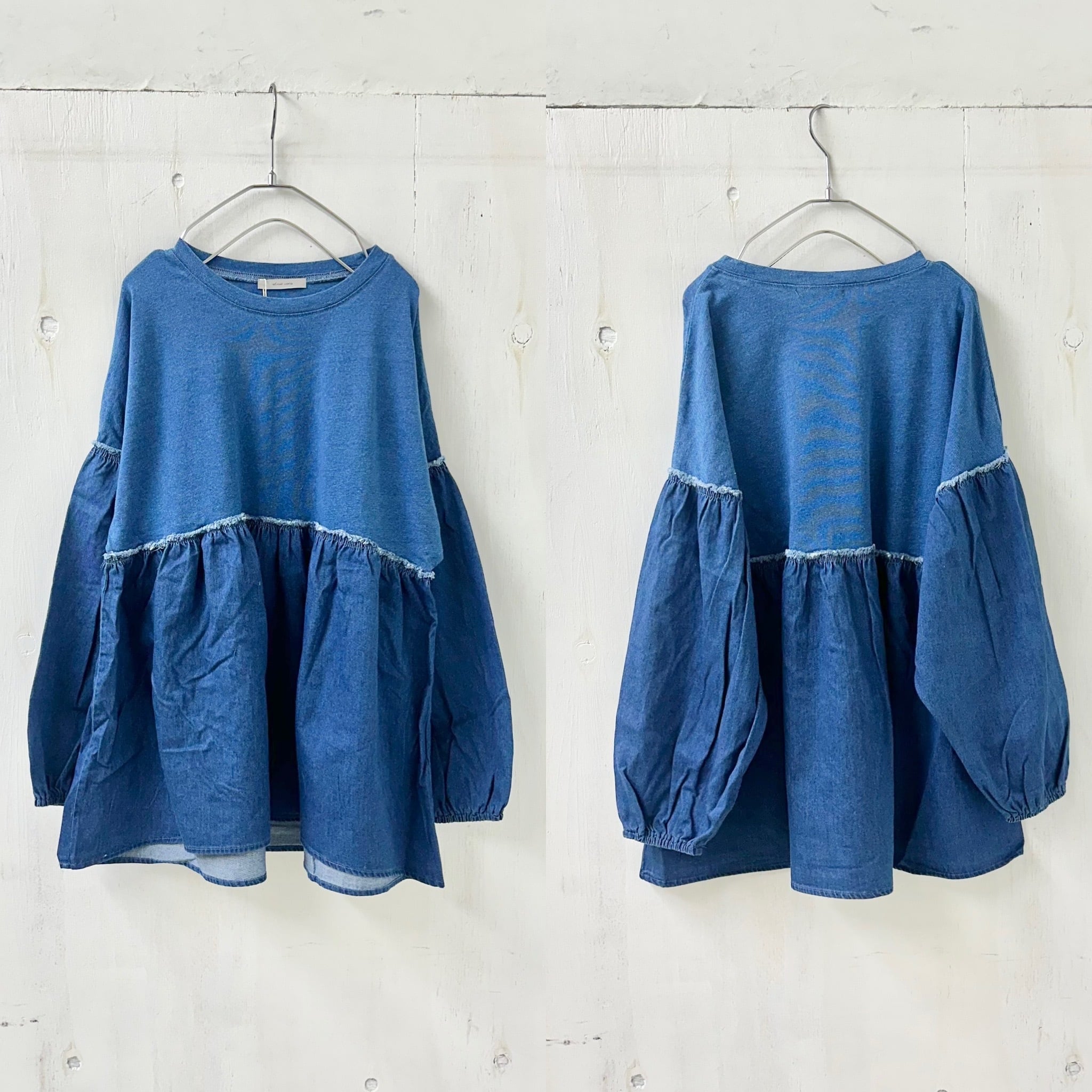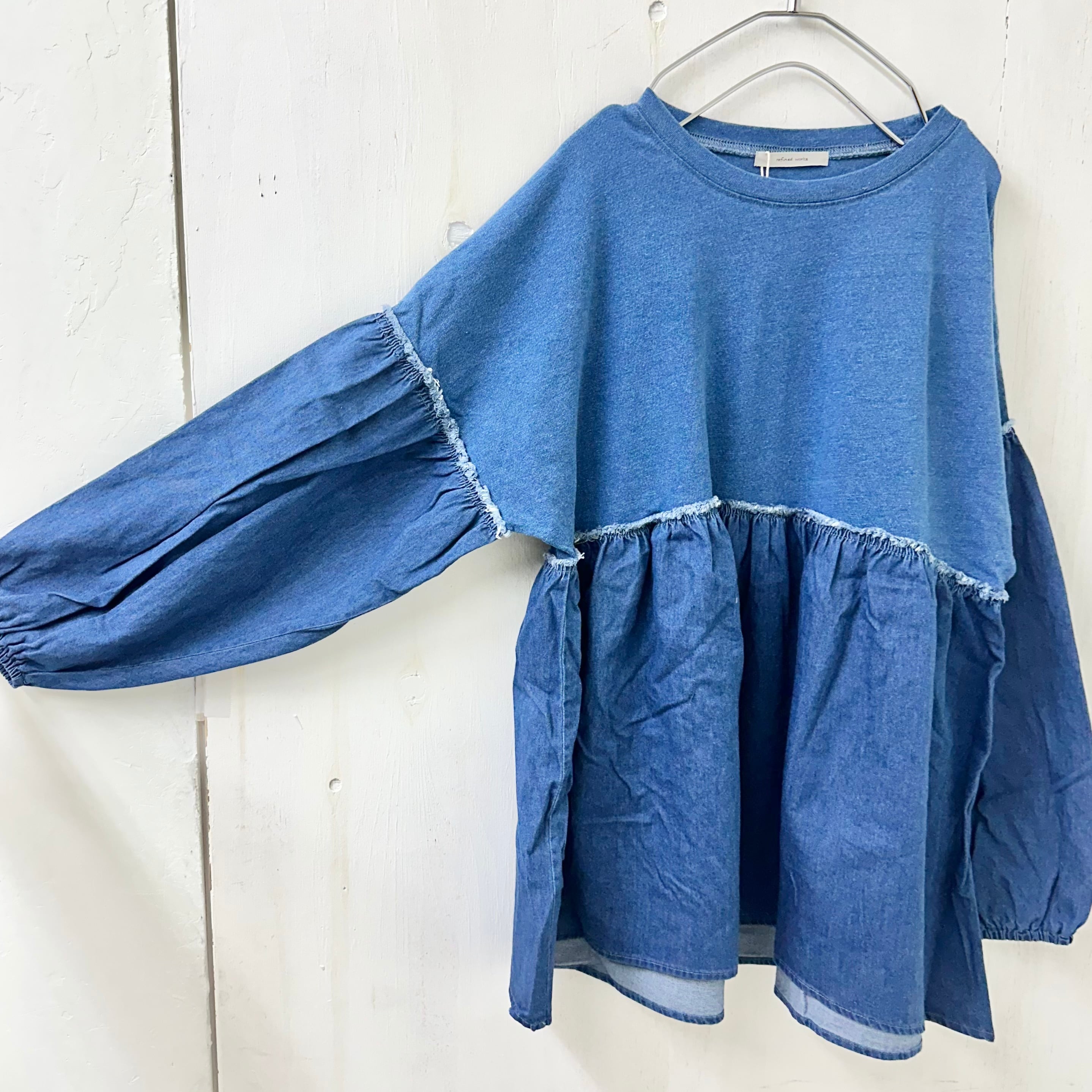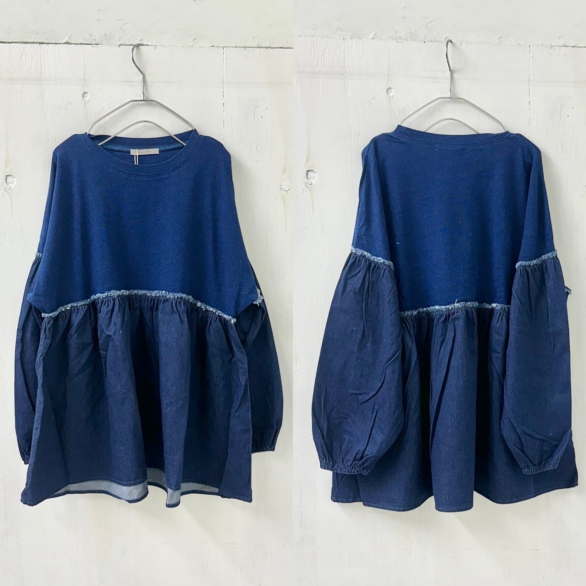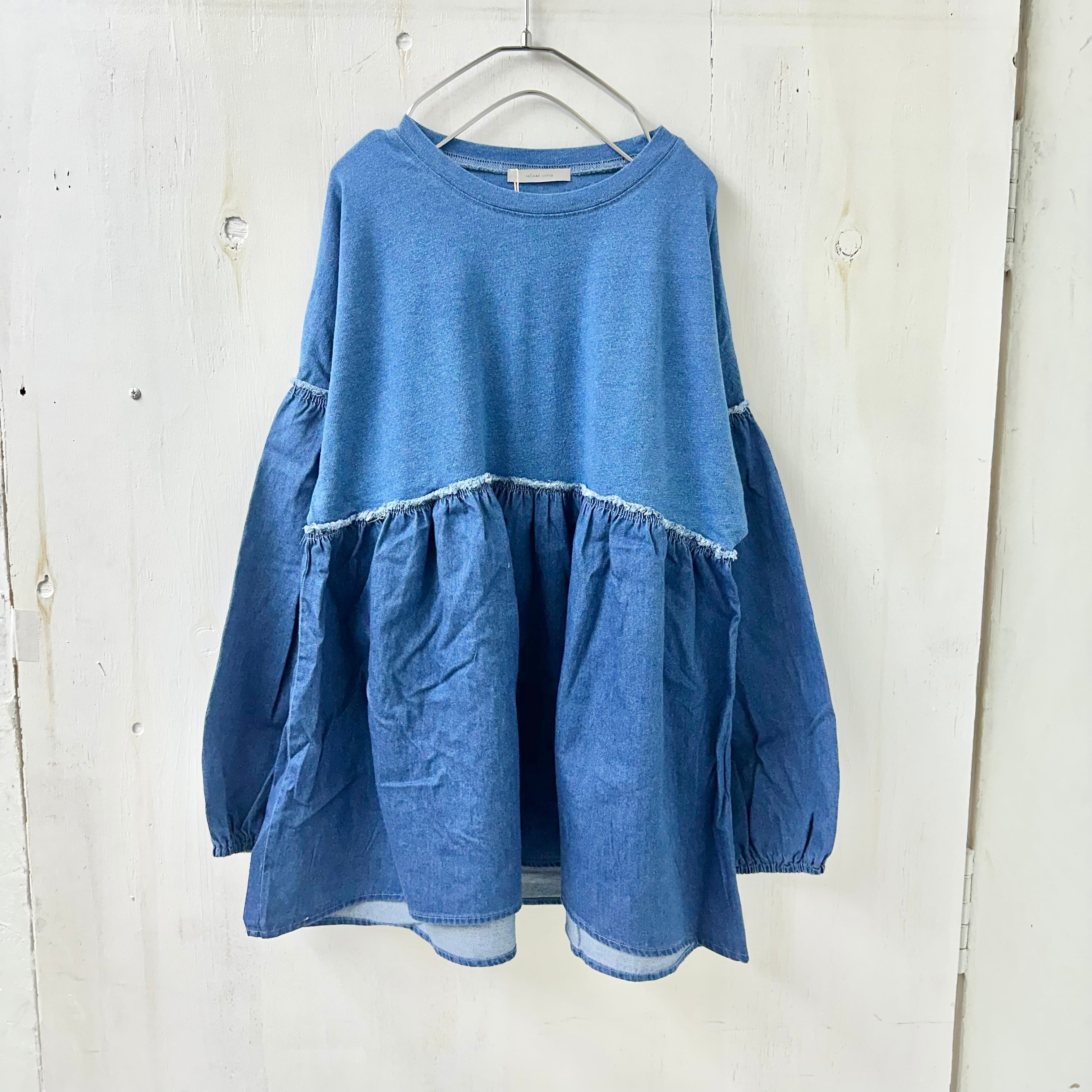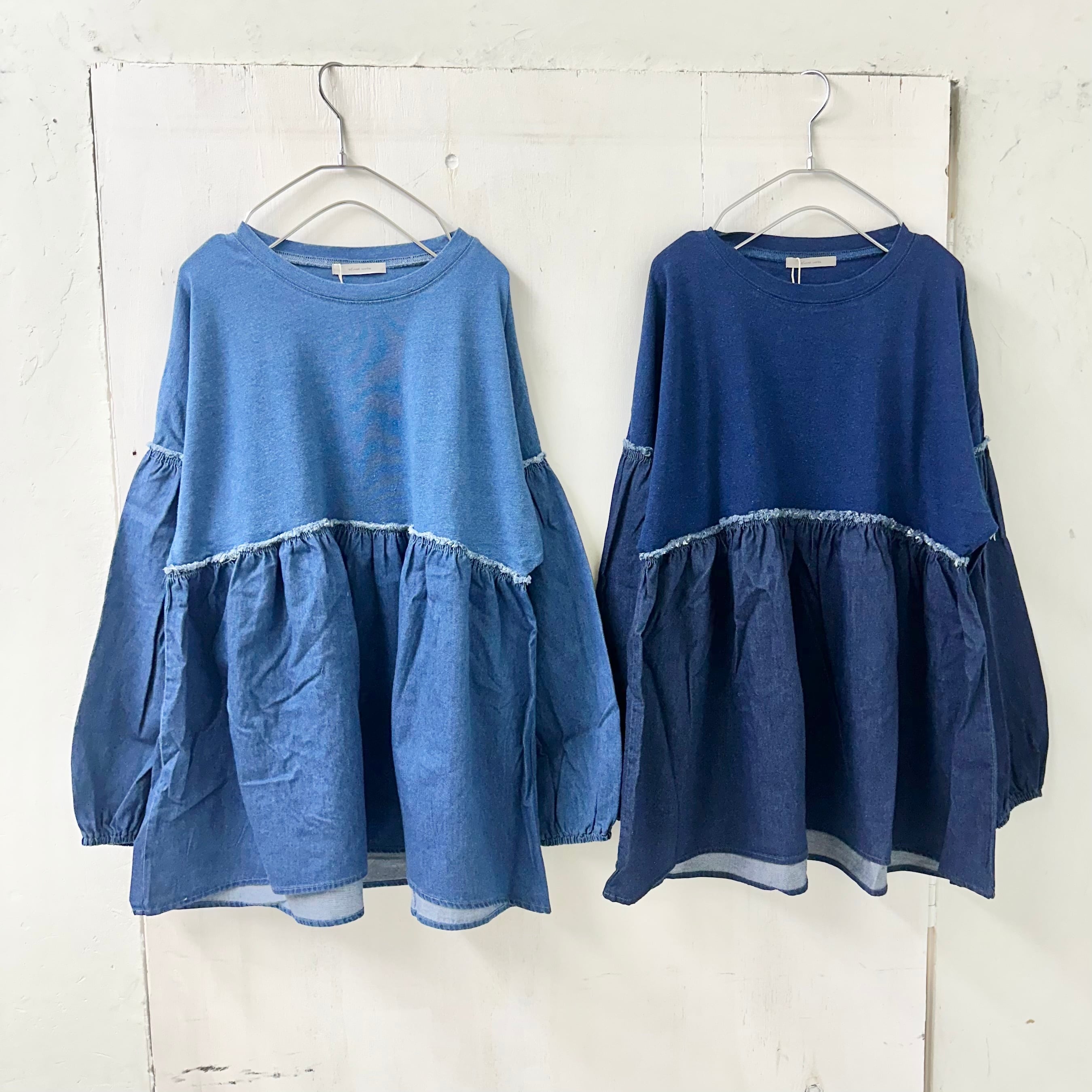 インディゴ天竺 x デニム切替 ギャザー TEE / 065-85303