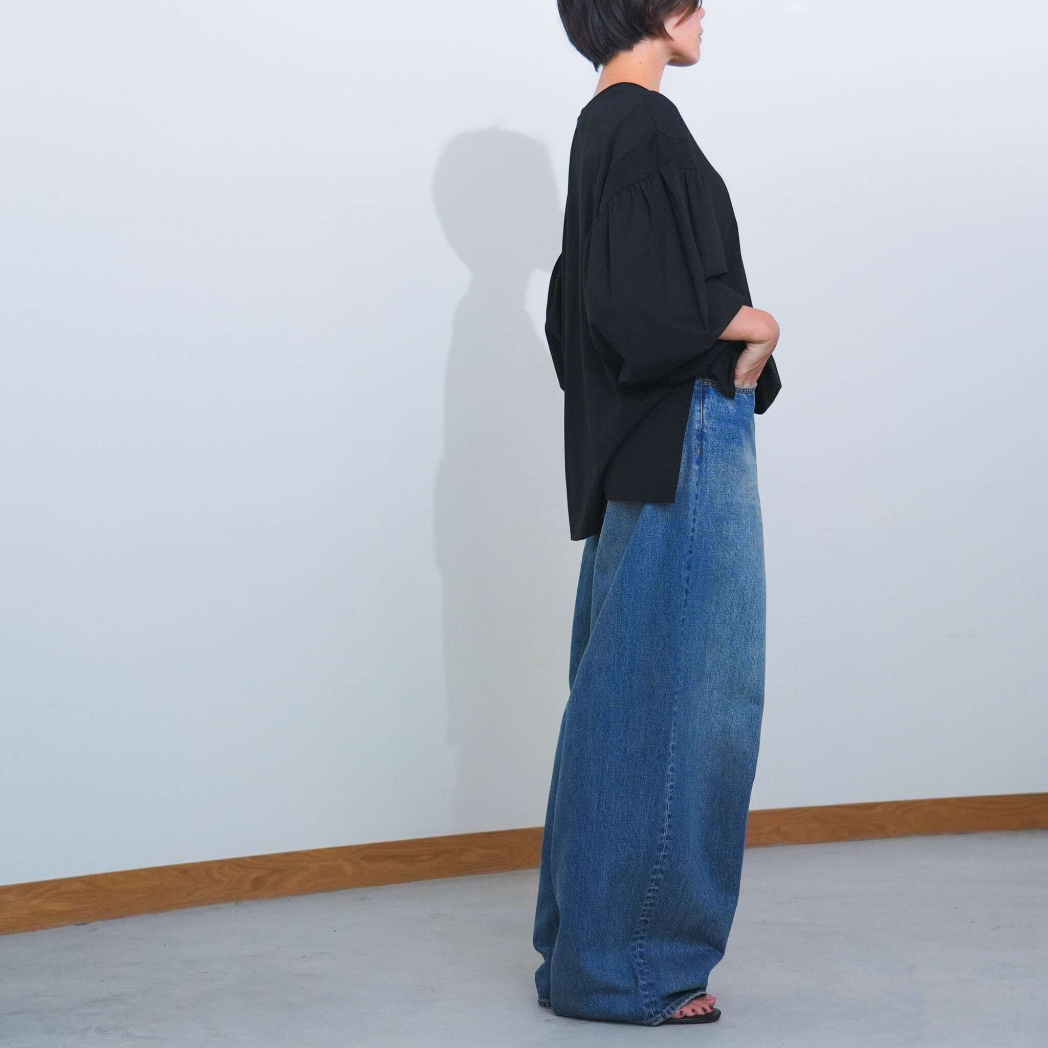 ドロップショルダーでワイドなシルエットに、袖切替えにはギャザーを施した