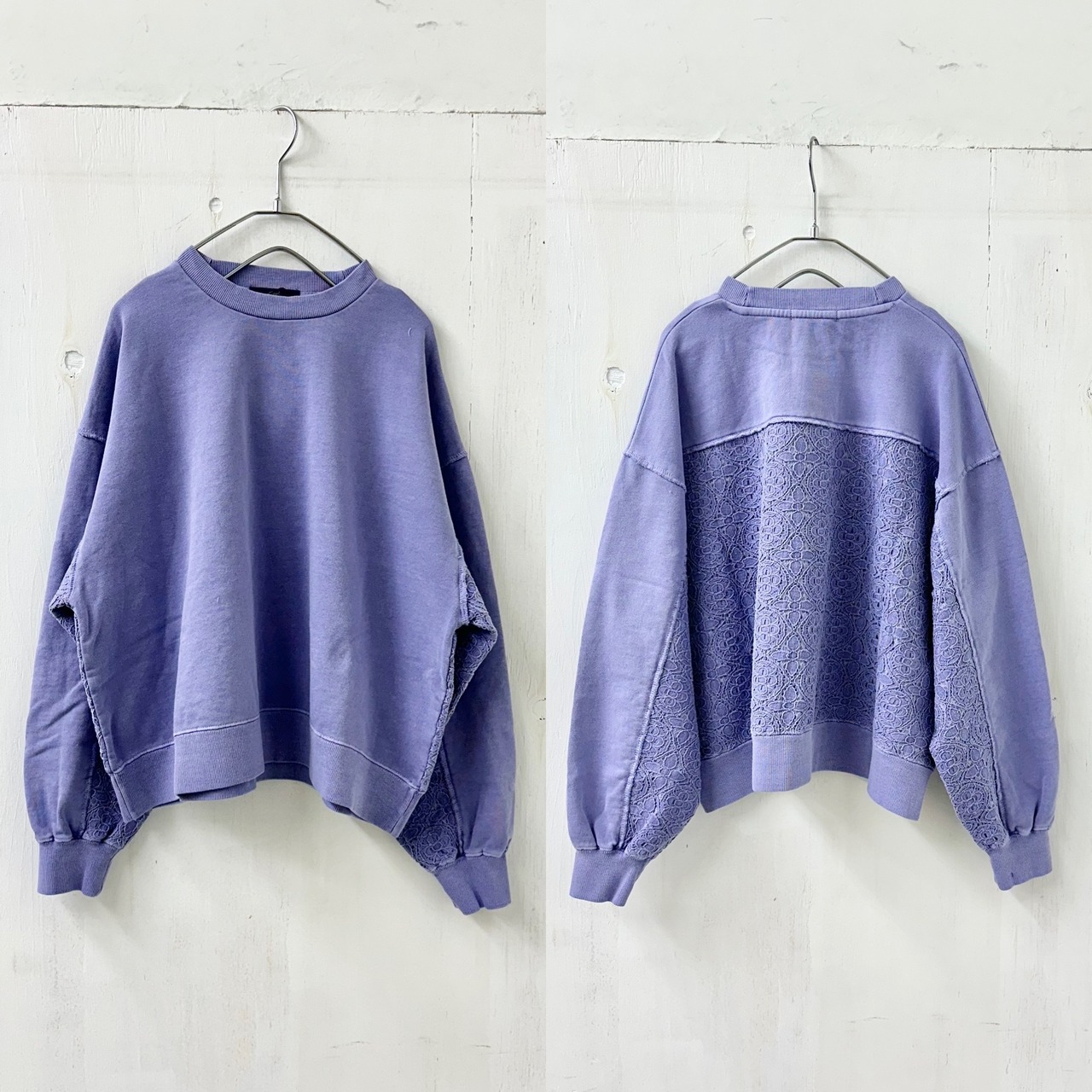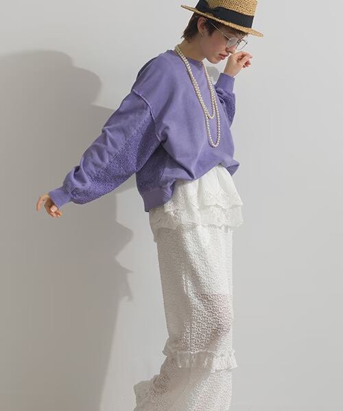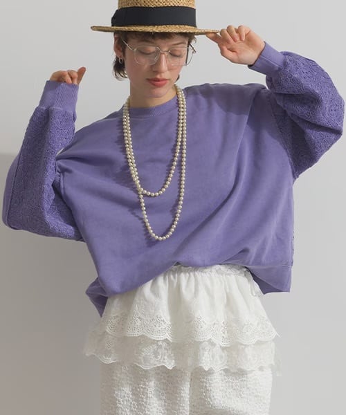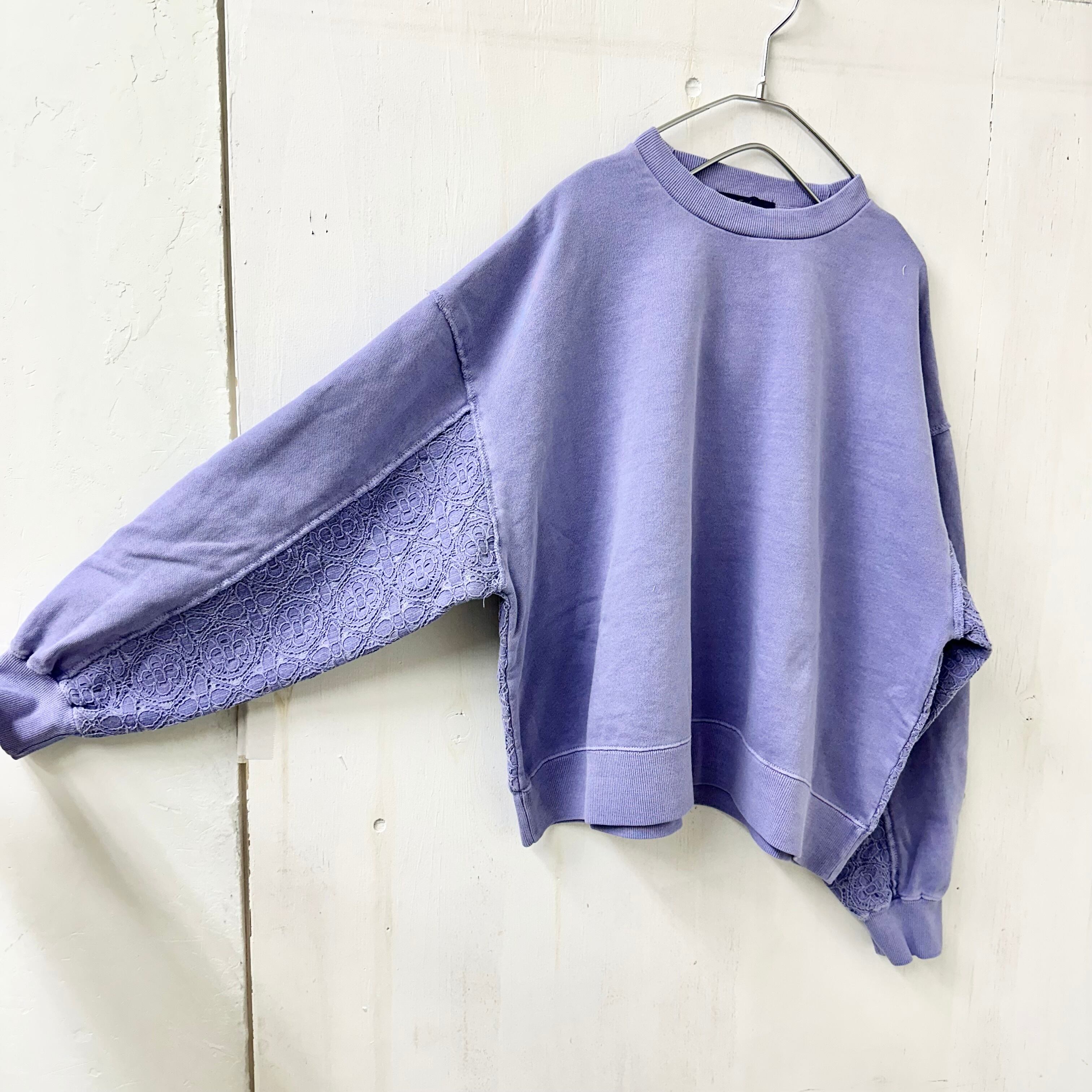 【FIGGLE / フィグル】裏毛 スウェット ユーズド加工 レース切替 プルオーバー