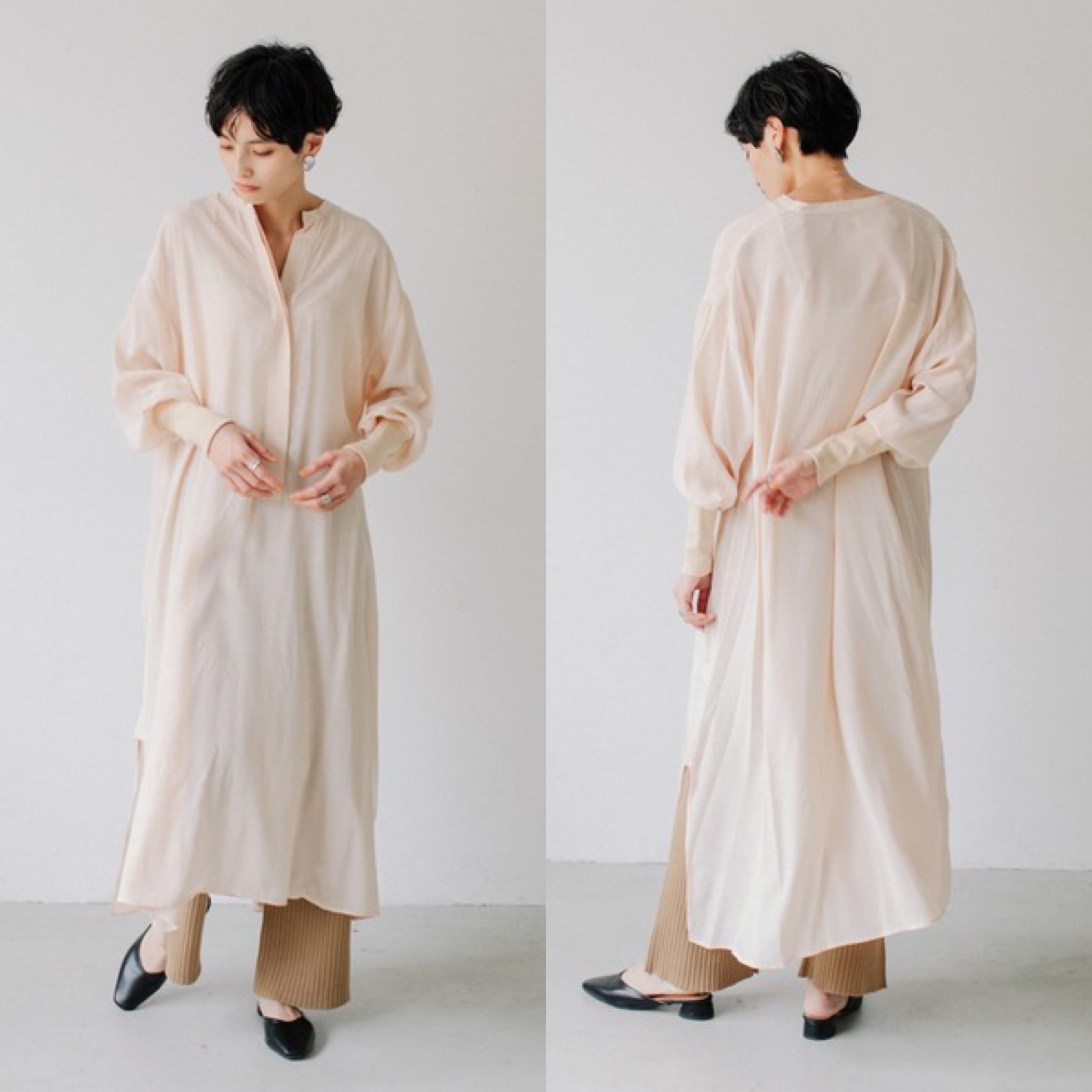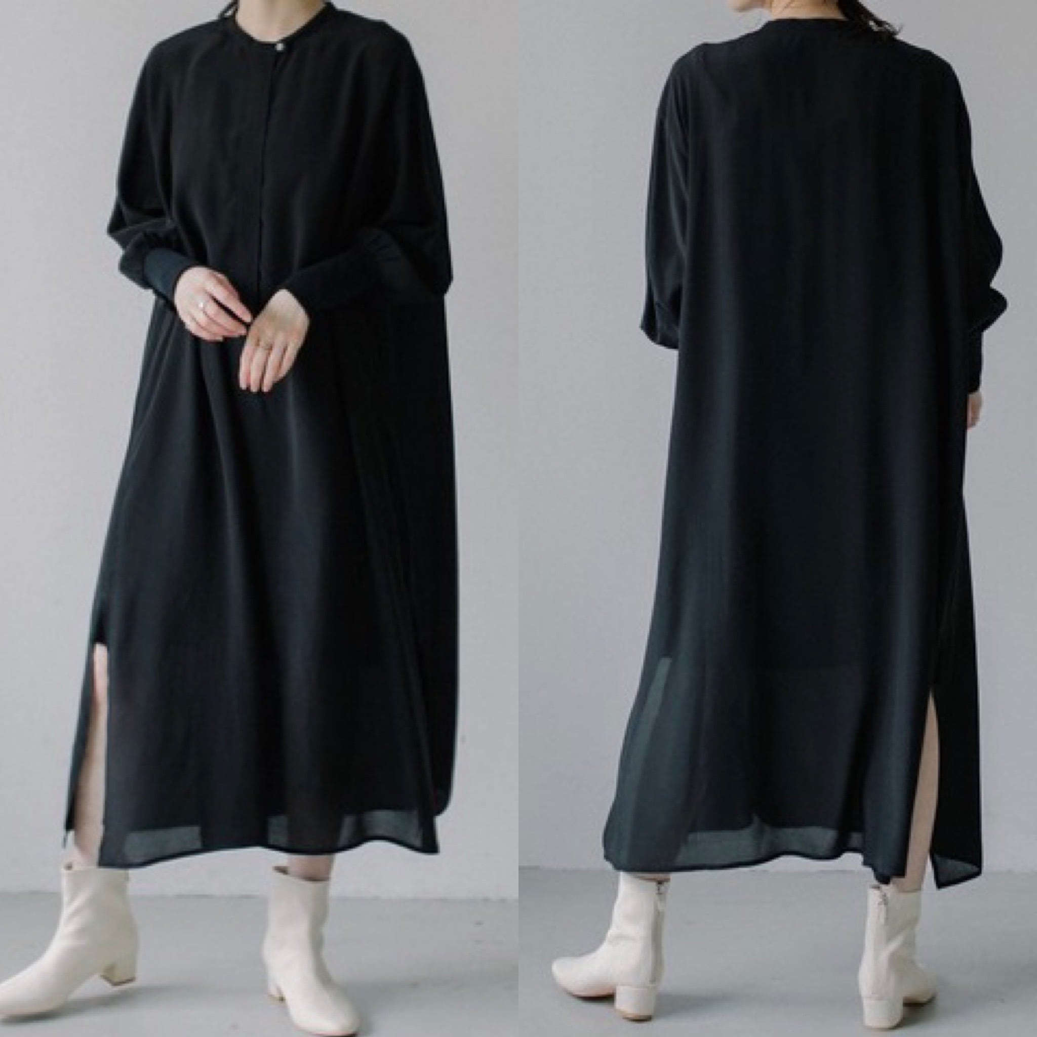 バンドカラー リブ付 ロング ワンピース