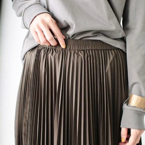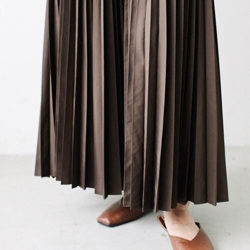 細かいピッチで、本数を贅沢に取った機械折りのプリーツ。タフタのダークトーンカラーが大人カジュアルに。