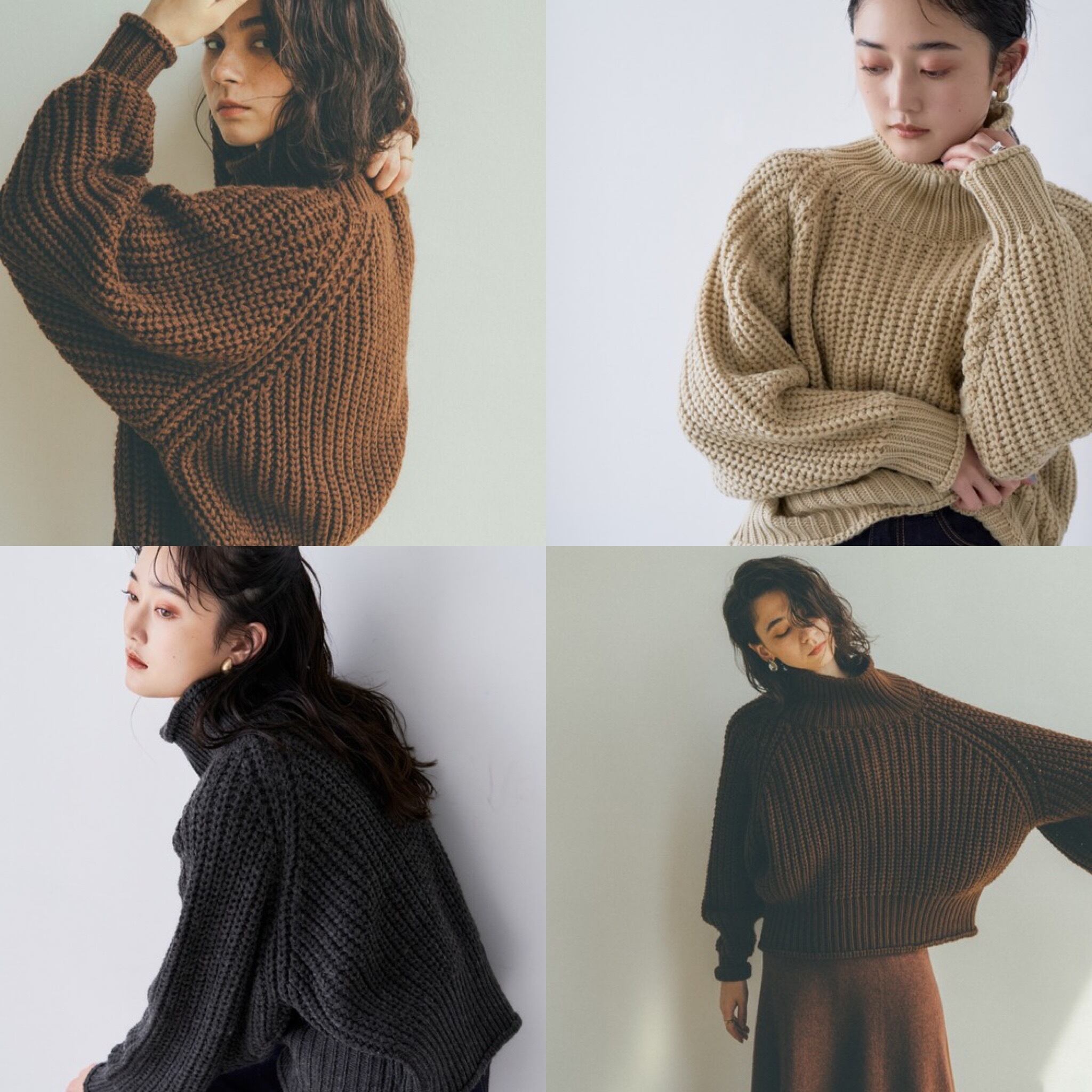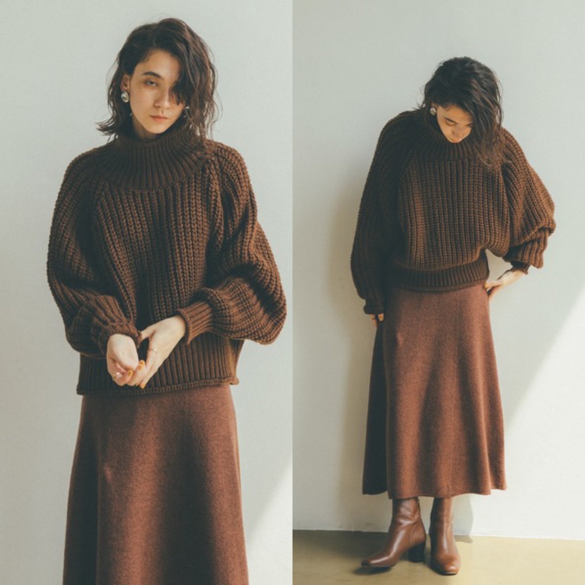 着丈を少し短め、ゆったりの袖にすることでニットのボリューム感が可愛く女性らしいハイネックニットに。