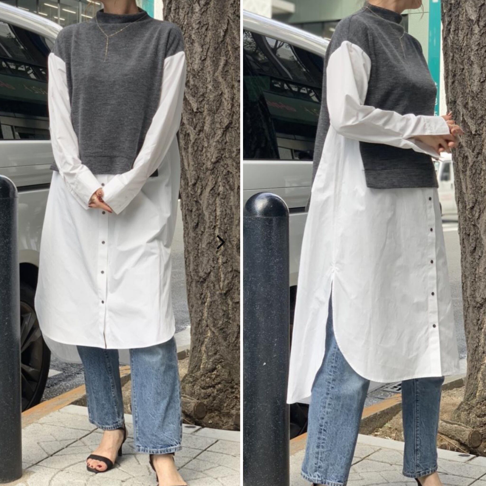 ニットxブラウスのドッキング ワンピースが。