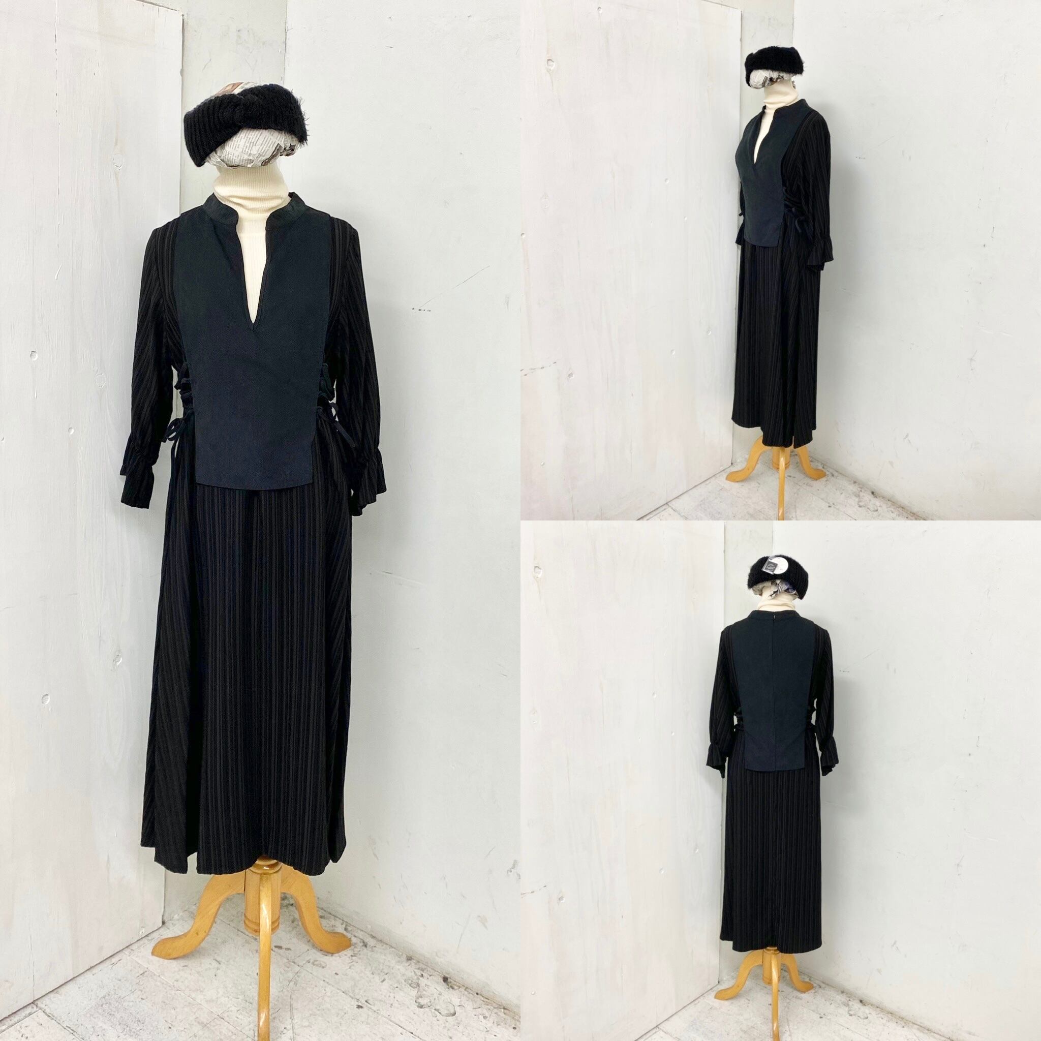 こちらはピーチスキン素材のVネックのベストがレイヤードされた凹凸感のあるロング ドレス。