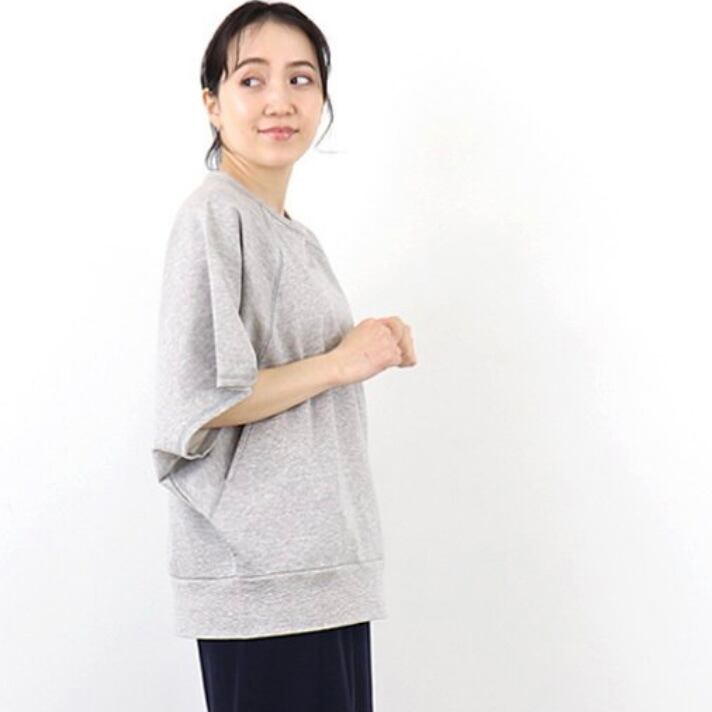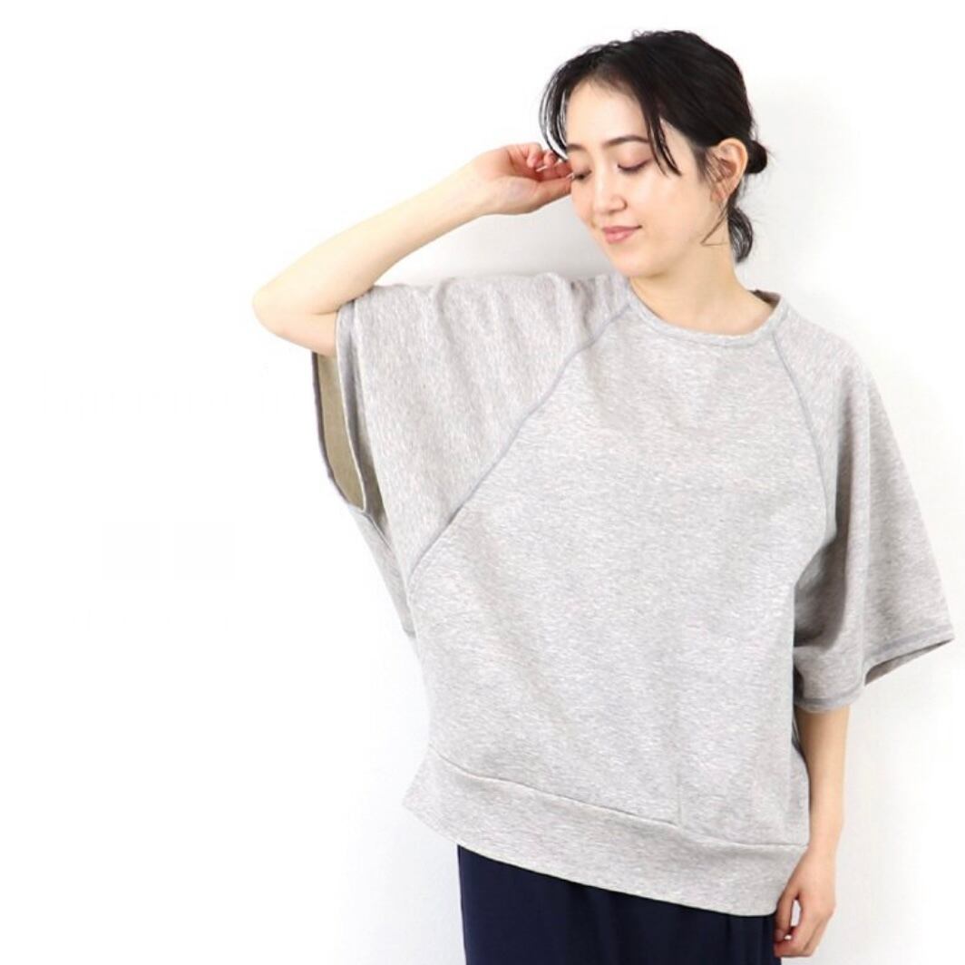 肘あたりまである緩いアームホールのラグランスリーブは長袖なんかとのレイヤードにも最適です