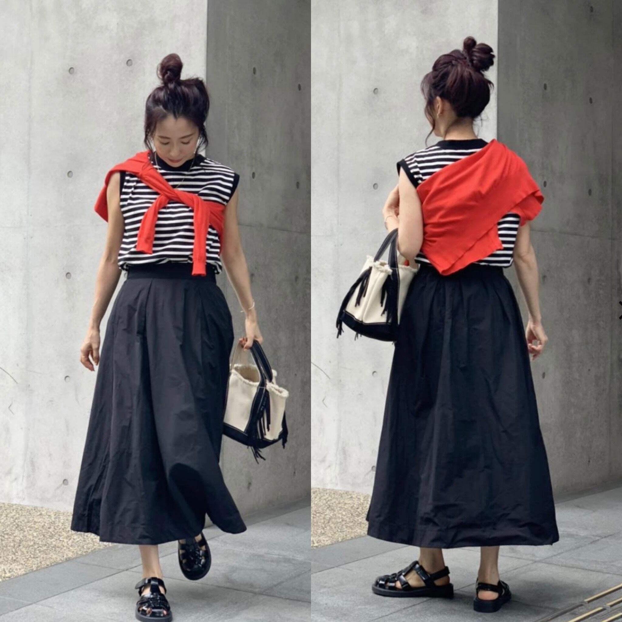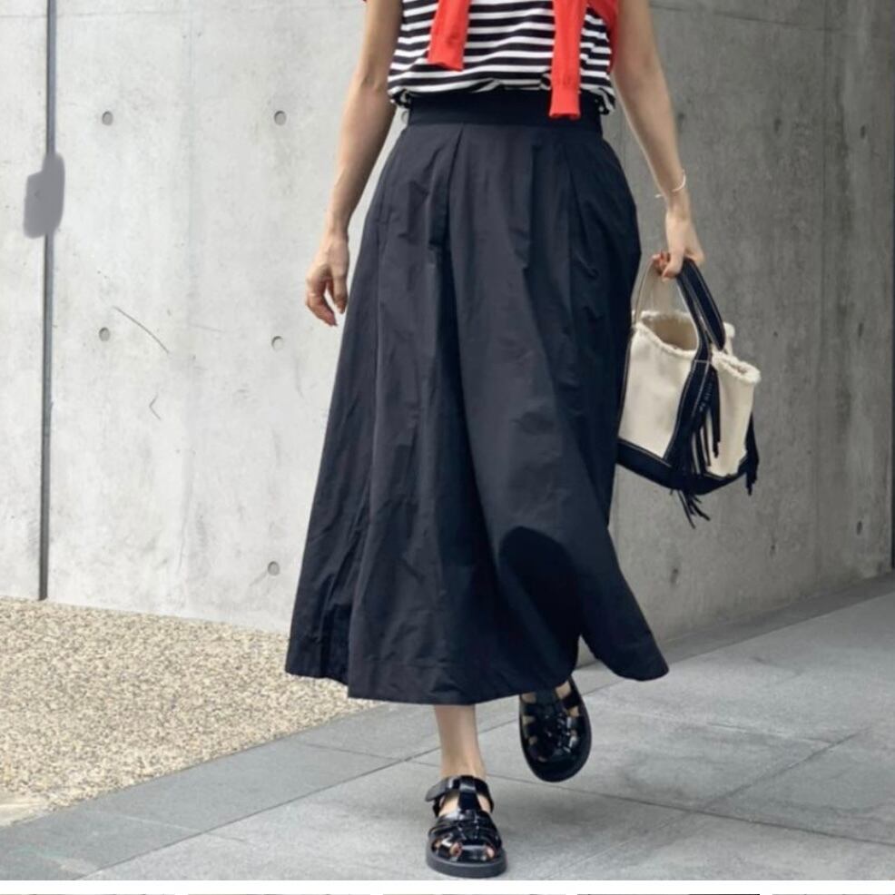 コットン混のメモリー素材を使用したフレアスカート。ウエストに2つのタックをいれ、腰回りのボリューム感をおさえたシルエットが◎
