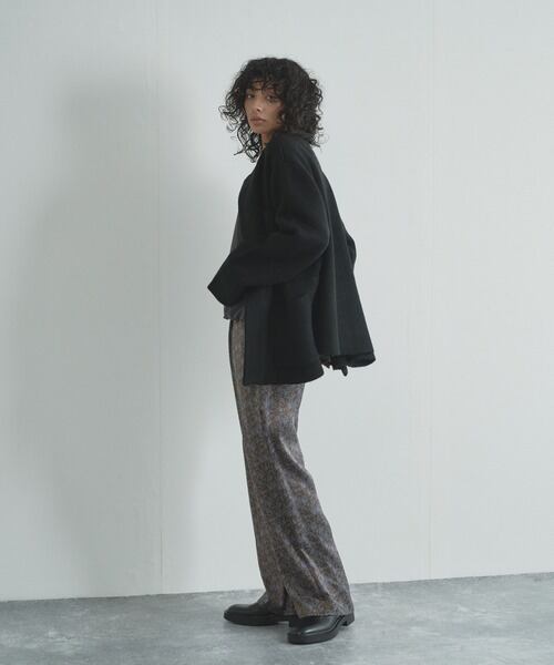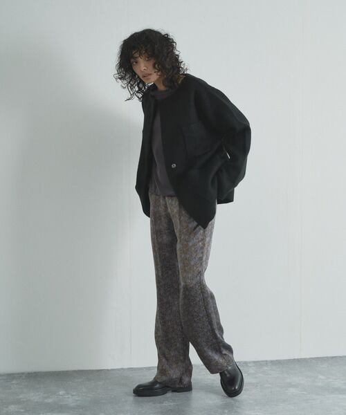 ダブルジャカードをふんわり編み、重くなく温かさを逃がさない編地で季節のはざまに重宝するニットアウターです。