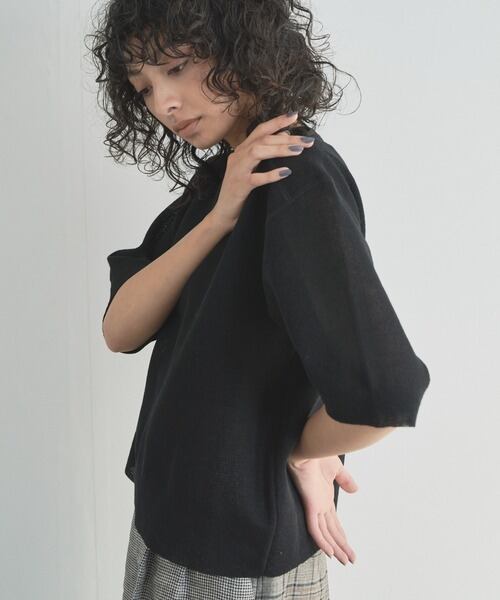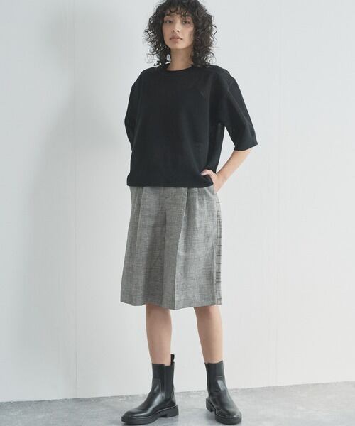 麻混の細く固めの糸で甘くミラノリブで編み立てた立体感のある透け感、ハリ、光沢感のあるキレイ見えするニットです。