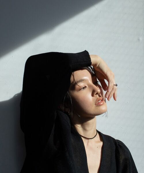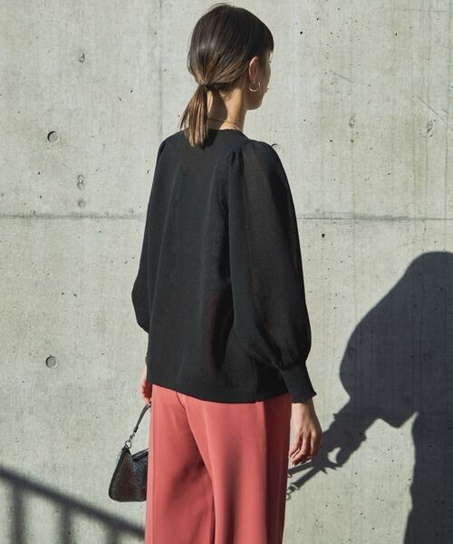 すっきりとしたVネックにジャケットライクな美しいシルエット。素材を活かしたボリューム袖がトレンドライクで◎