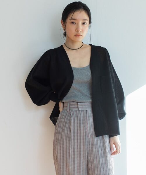 胸元のスクエアポケットがさりげないアクセントで、程よいシアー感とハリのある上品な大人のカーディガンに。