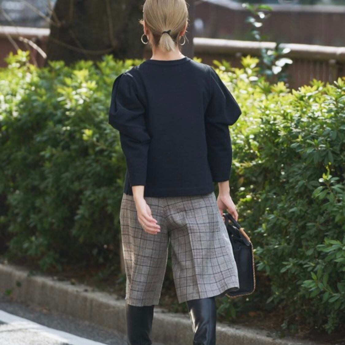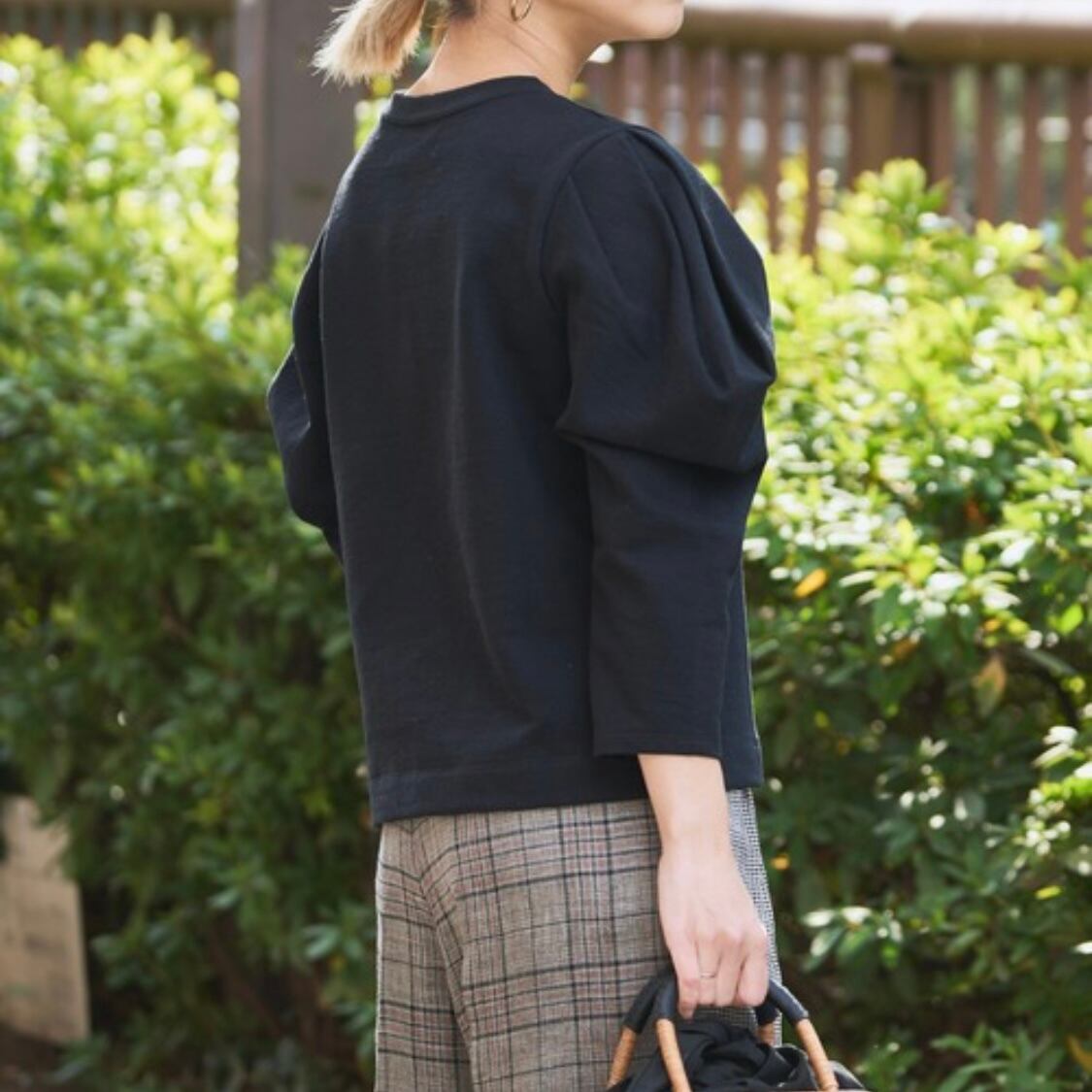 カジュアル過ぎない風合いが綺麗見えするスウェット素材で作られた、トレンドの袖コンシャス、マトンスリーブのクルーネックトップス。