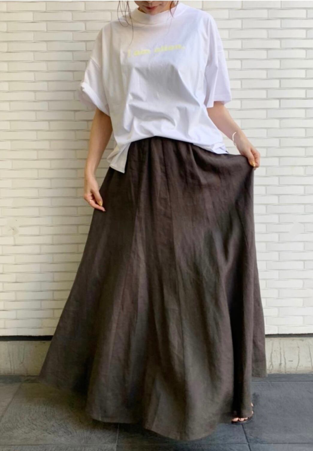 今季ひとつは押さえたいフレアのロング スカート。こちらは上質のリネン素材でつくられた