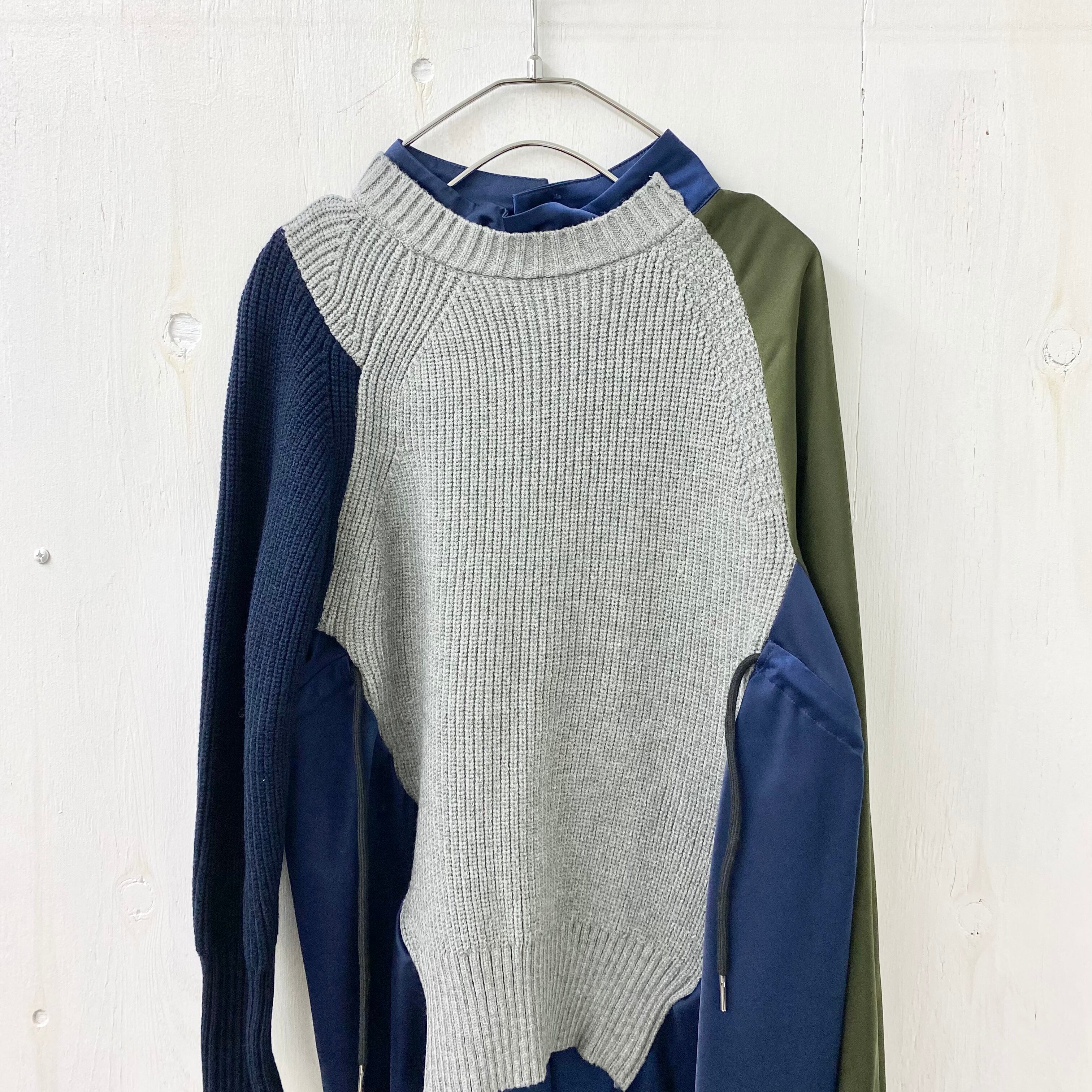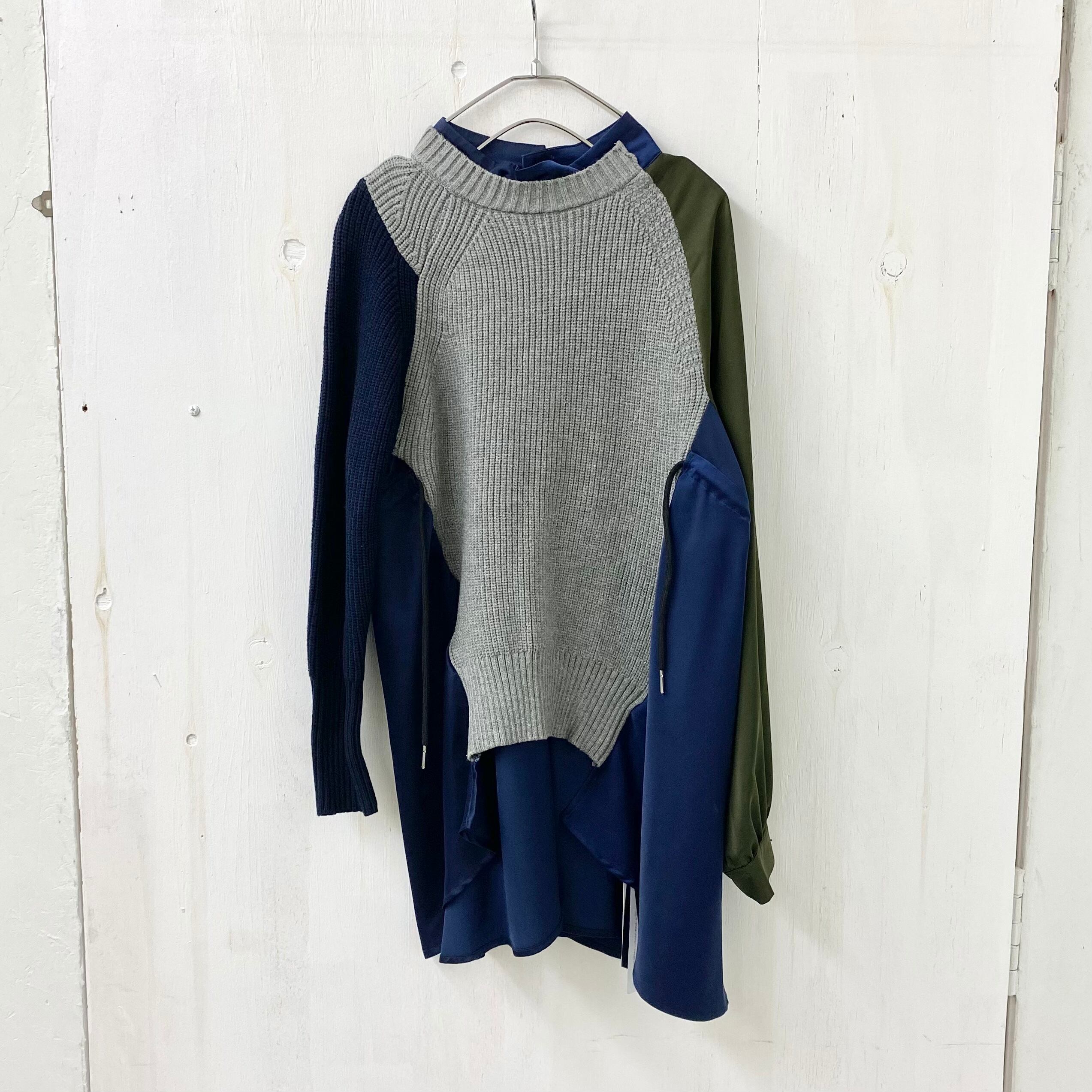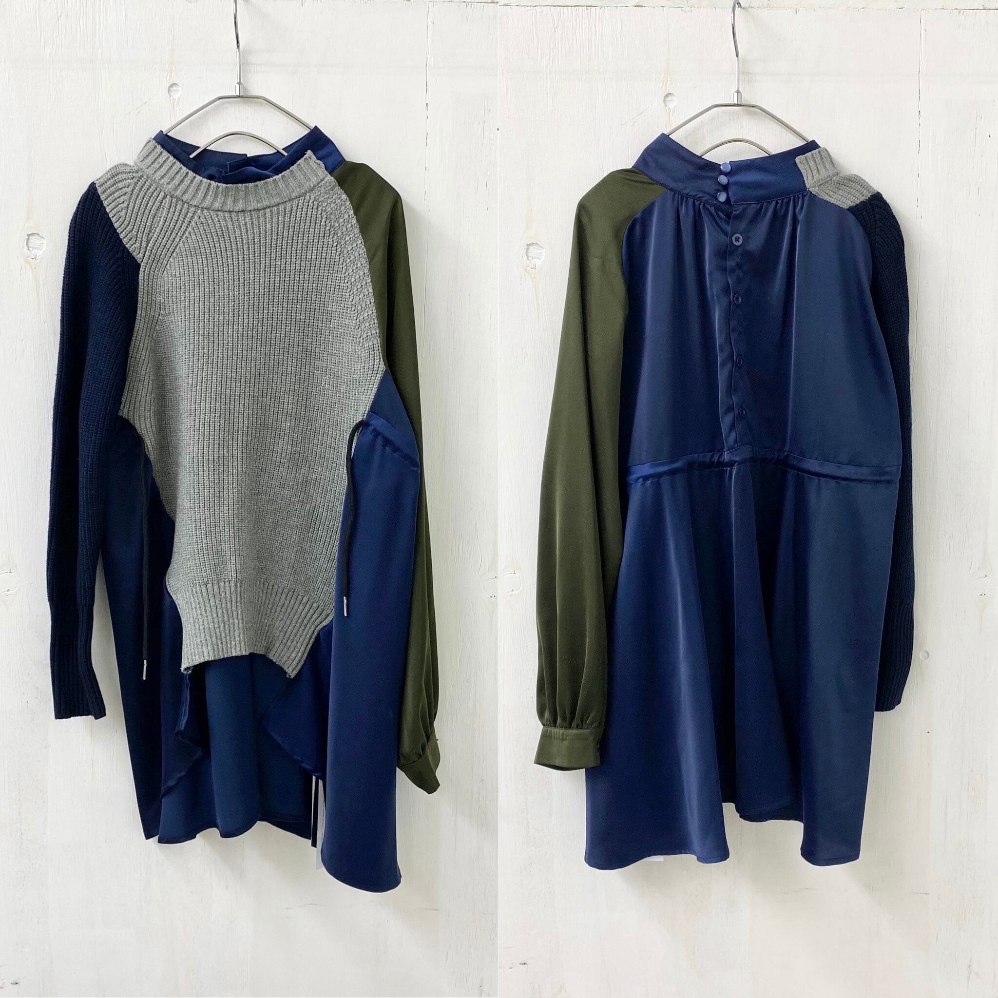 ミカーレ得意のアシンメトリー&異素材ドッキング、畔ニットにサテン ブラウスを切替えた