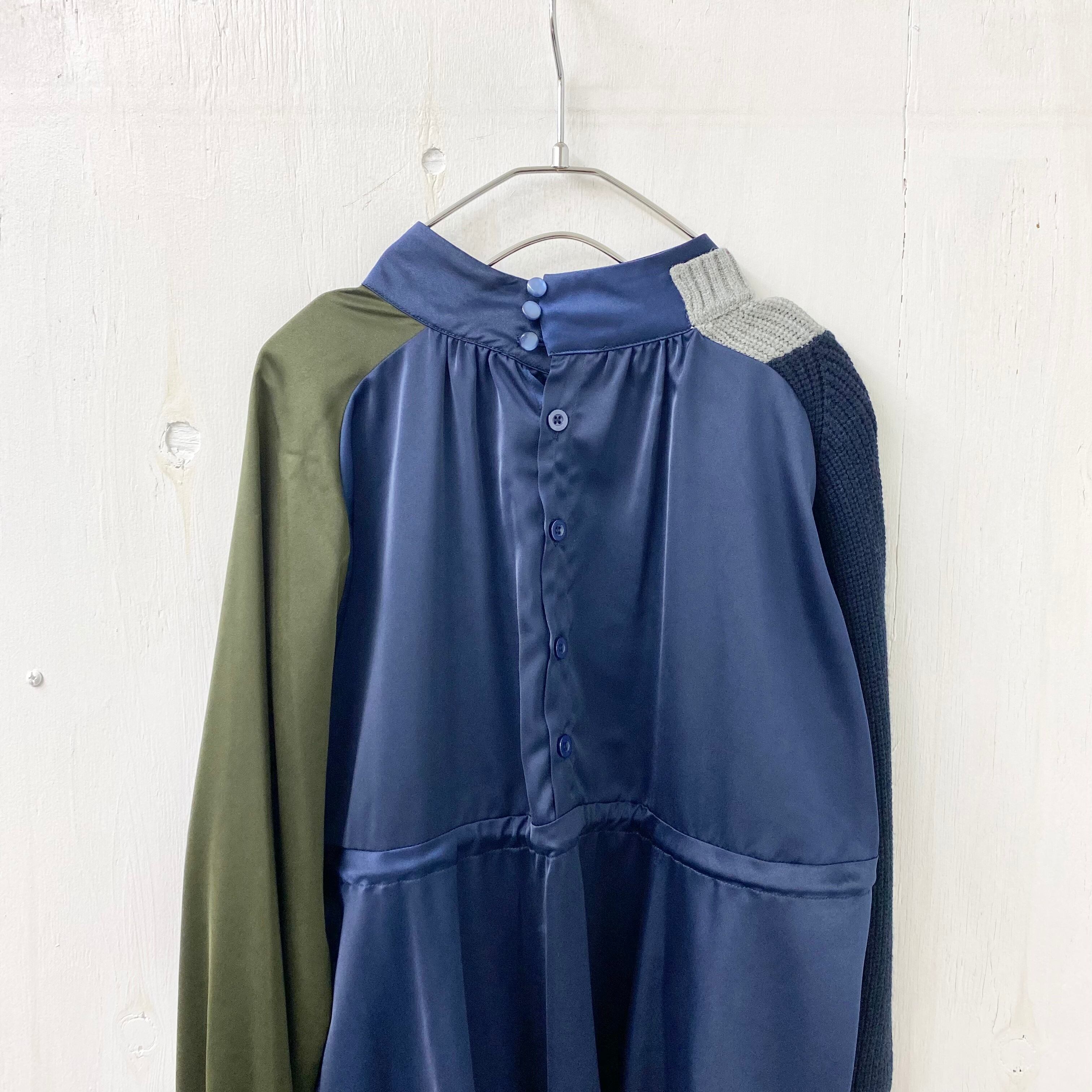 【micalle micalle】アシンメトリー 畔ニット X サテン モック プルオーバー ブラウス