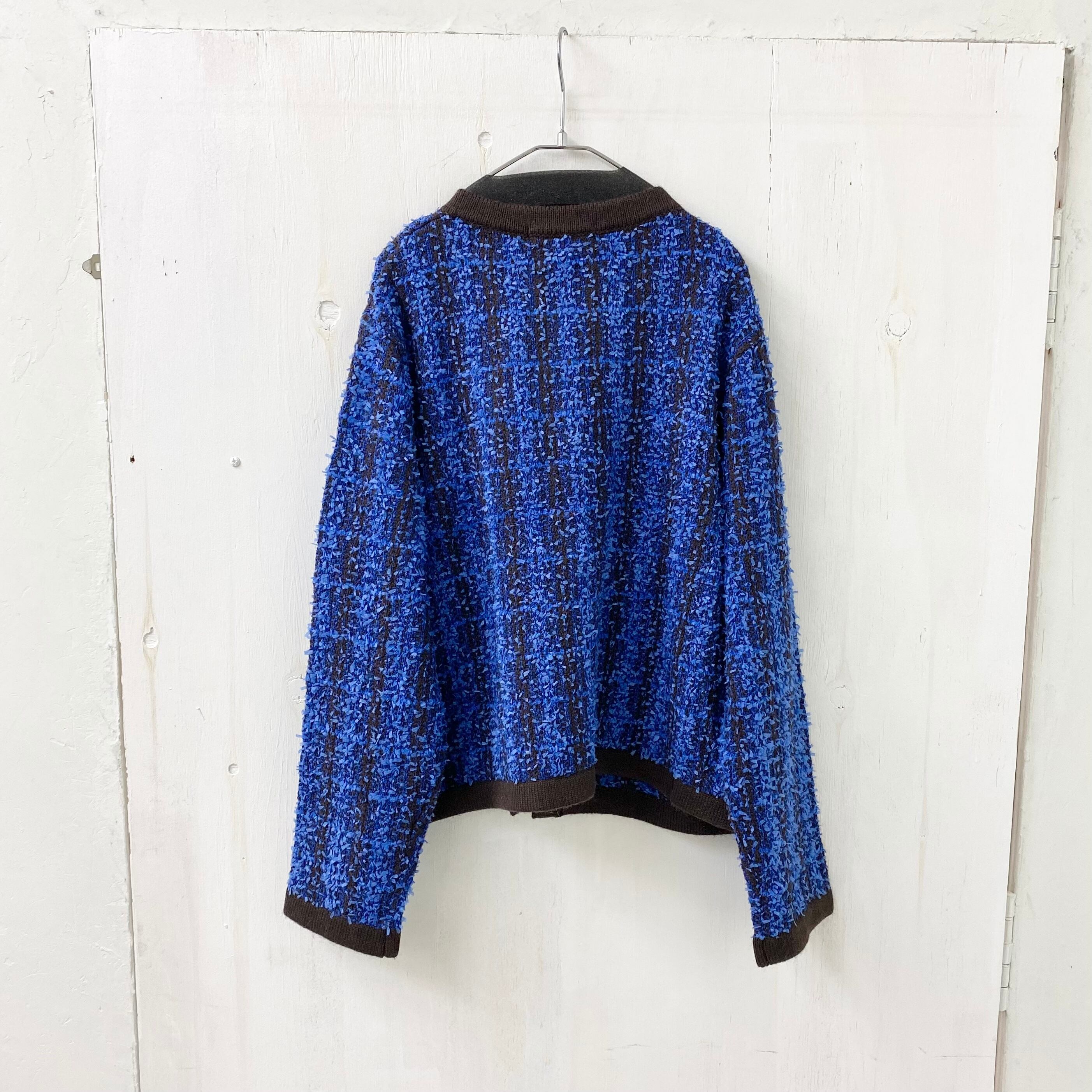 配色のトリミングデザインがクラシカルなニットジャケット。上品な光沢がほんのりと感じられるツイード風素材が高級感漂うオススメの1着です。