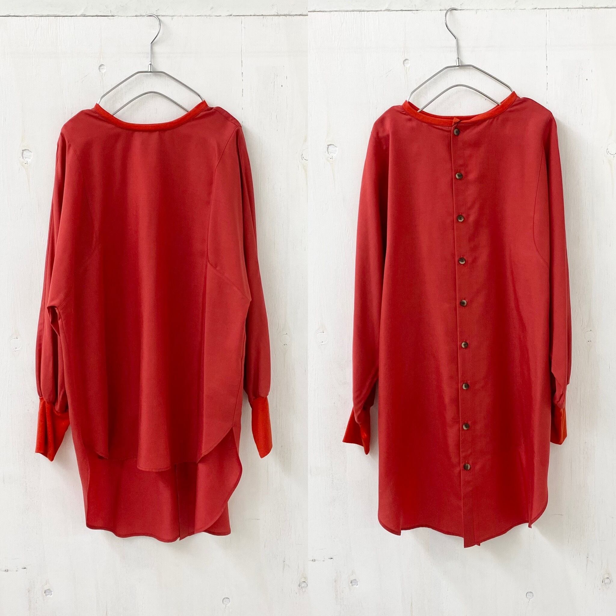 後ろの裾部分は長めにし、ヒップが隠れる前後差のあるデザインで前から見るとシンプルなデザインのブラウス、後ろ部分をボタンにすることでデザイン性のあるお洒落な印象に。