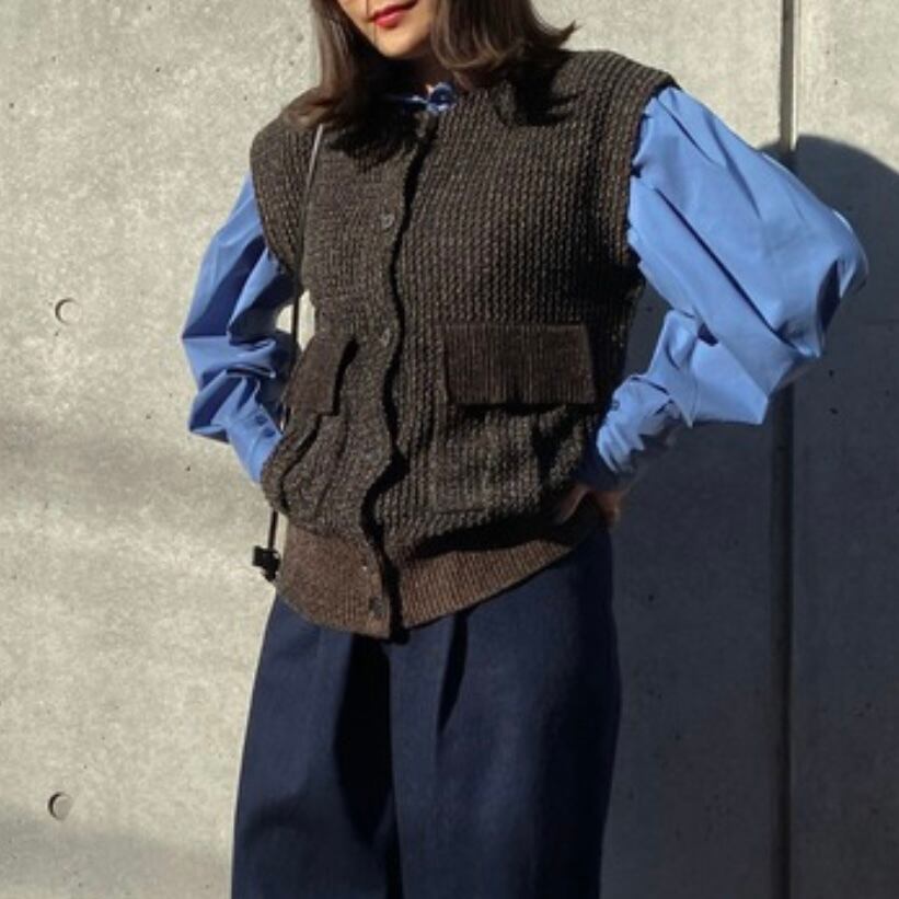 レイヤードスタイルが華やかに映えるツイード風ニットベストが登場。