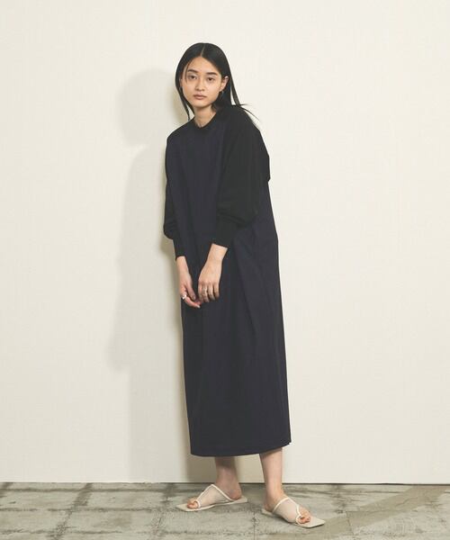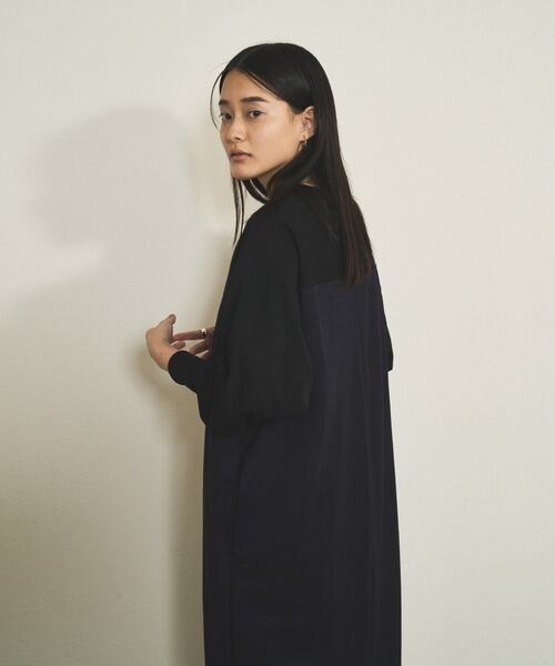 布帛とカットソーの異素材を切り替え、シンプル見えしながらも表情のあるワンピースです。