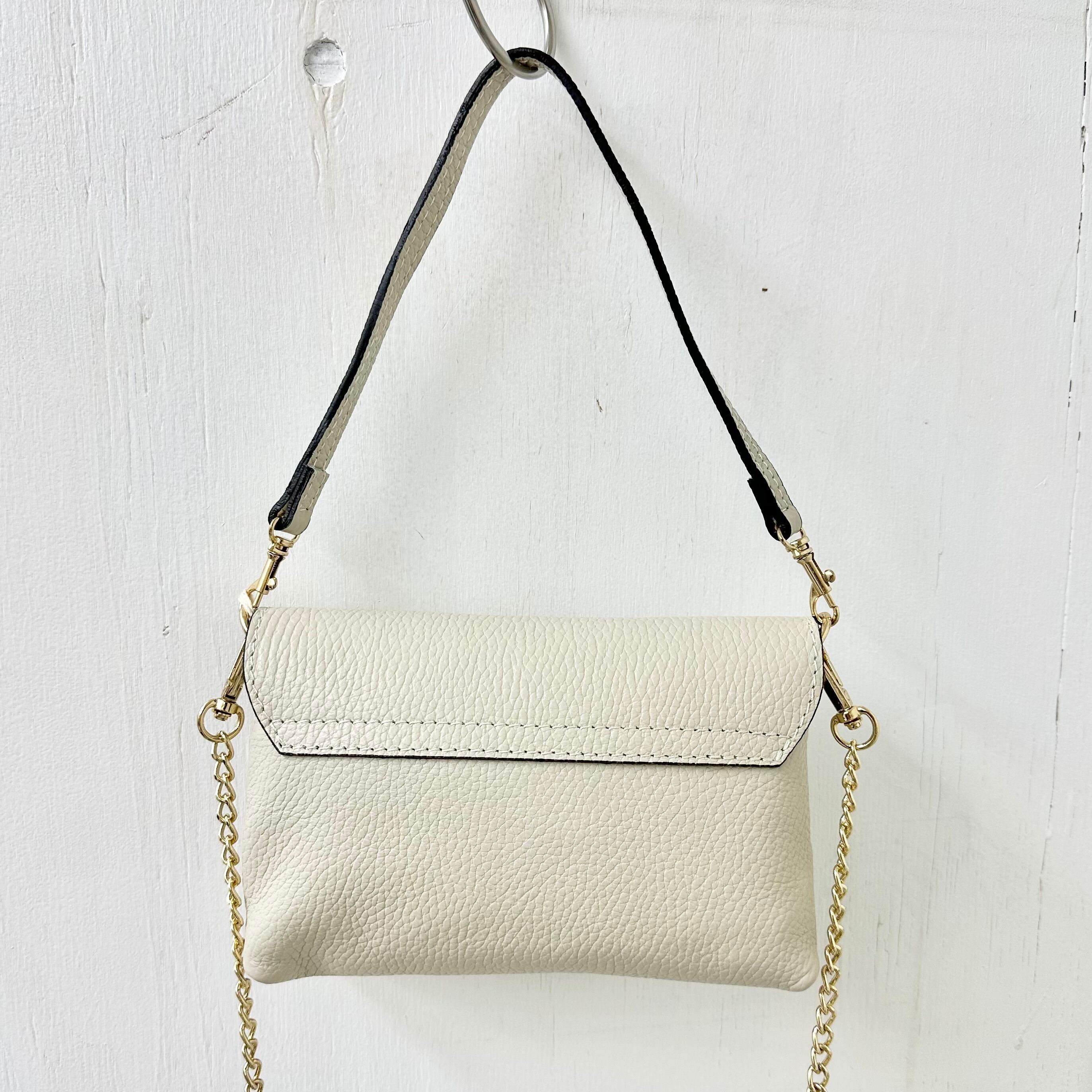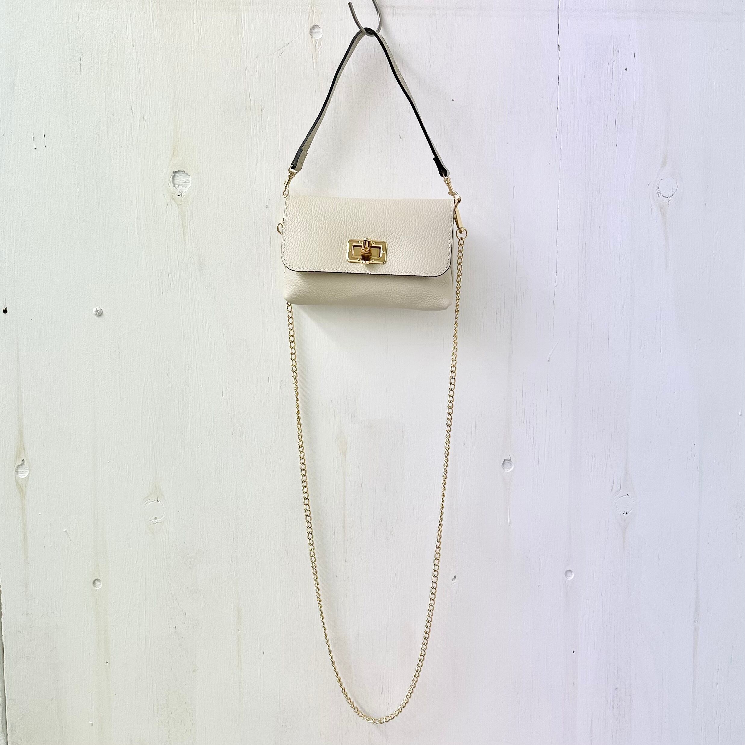 可愛い長さの革ベルト&細目のラグジュアリーなゴールド チェーンのショルダー使いに