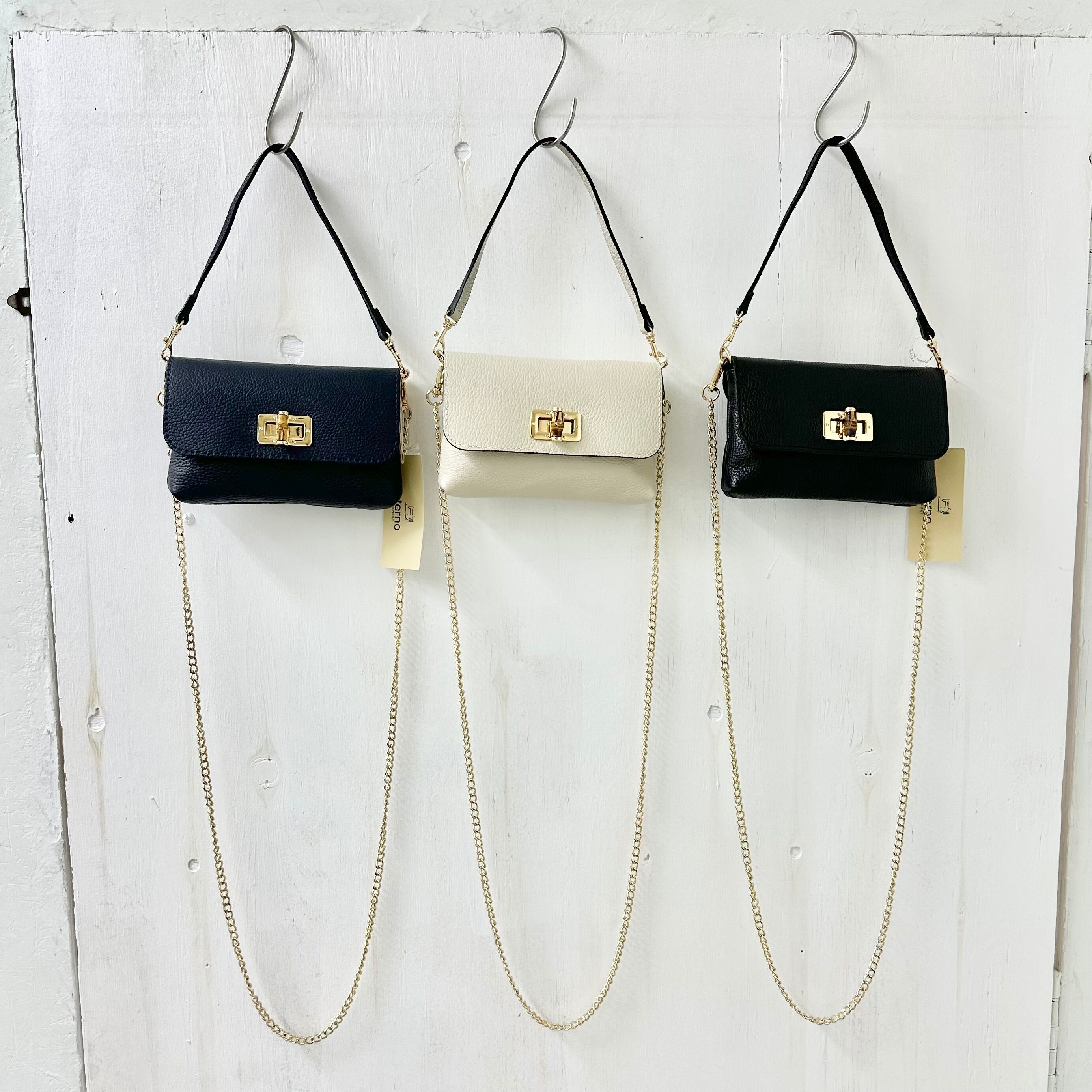 可愛い長さの革ベルト&細目のラグジュアリーなゴールド チェーンのショルダー使いに