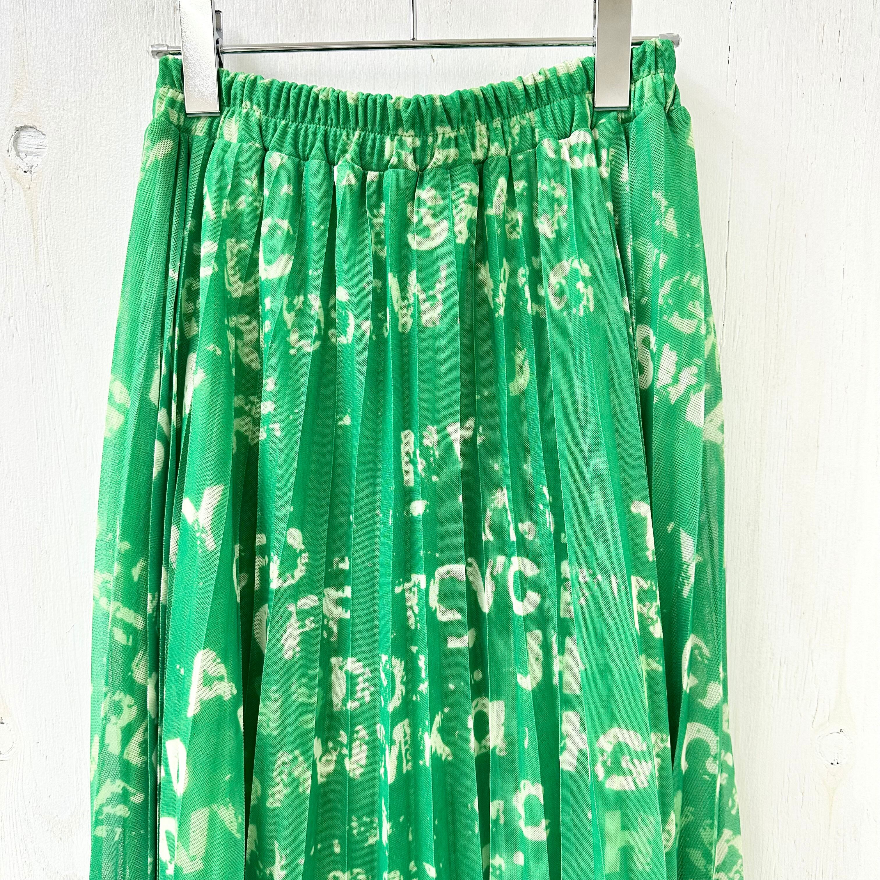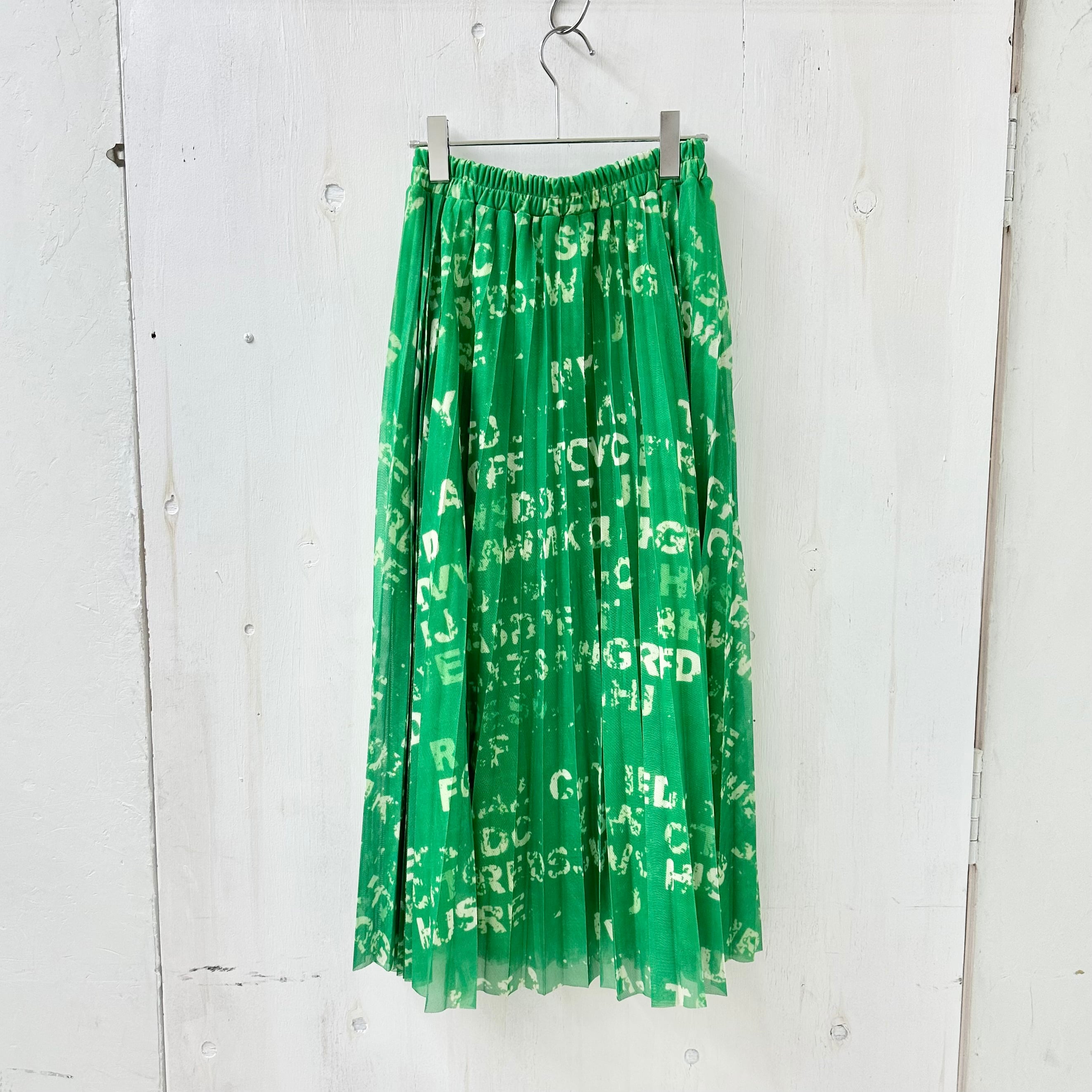 チュール素材のプリーツ スカートが登場。ランダムに抜染プリントされたアルファベットが