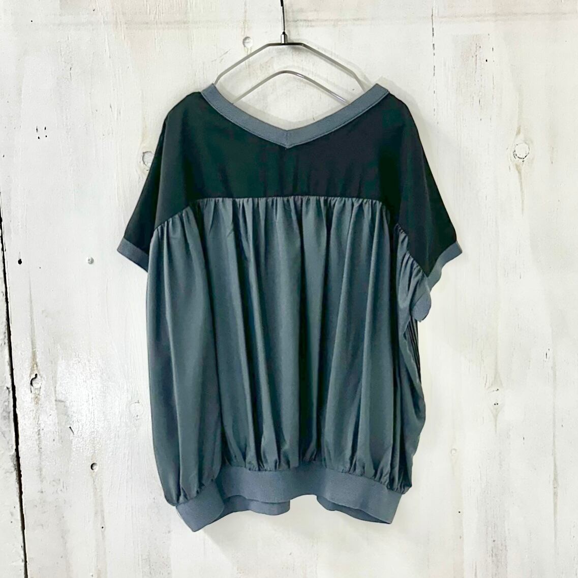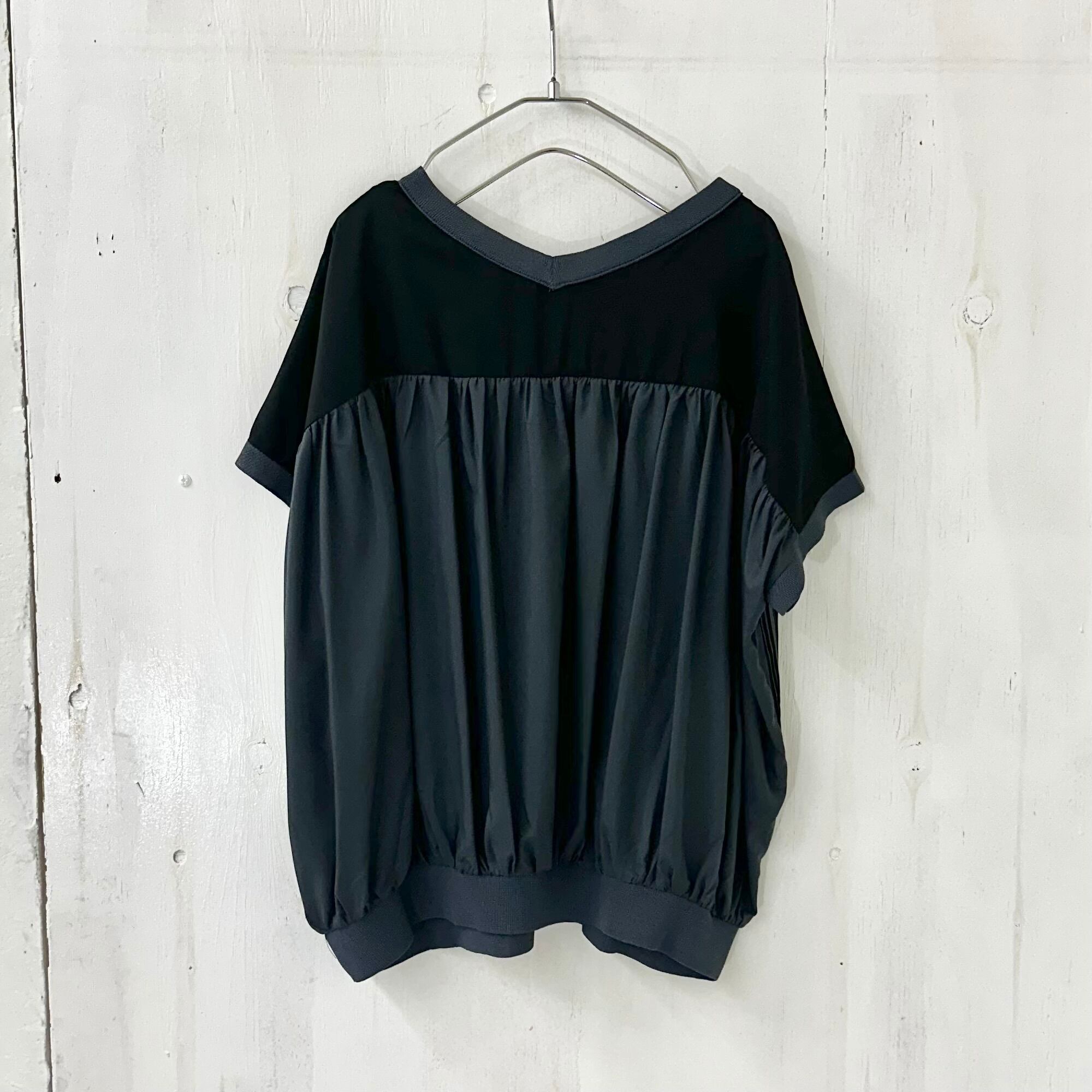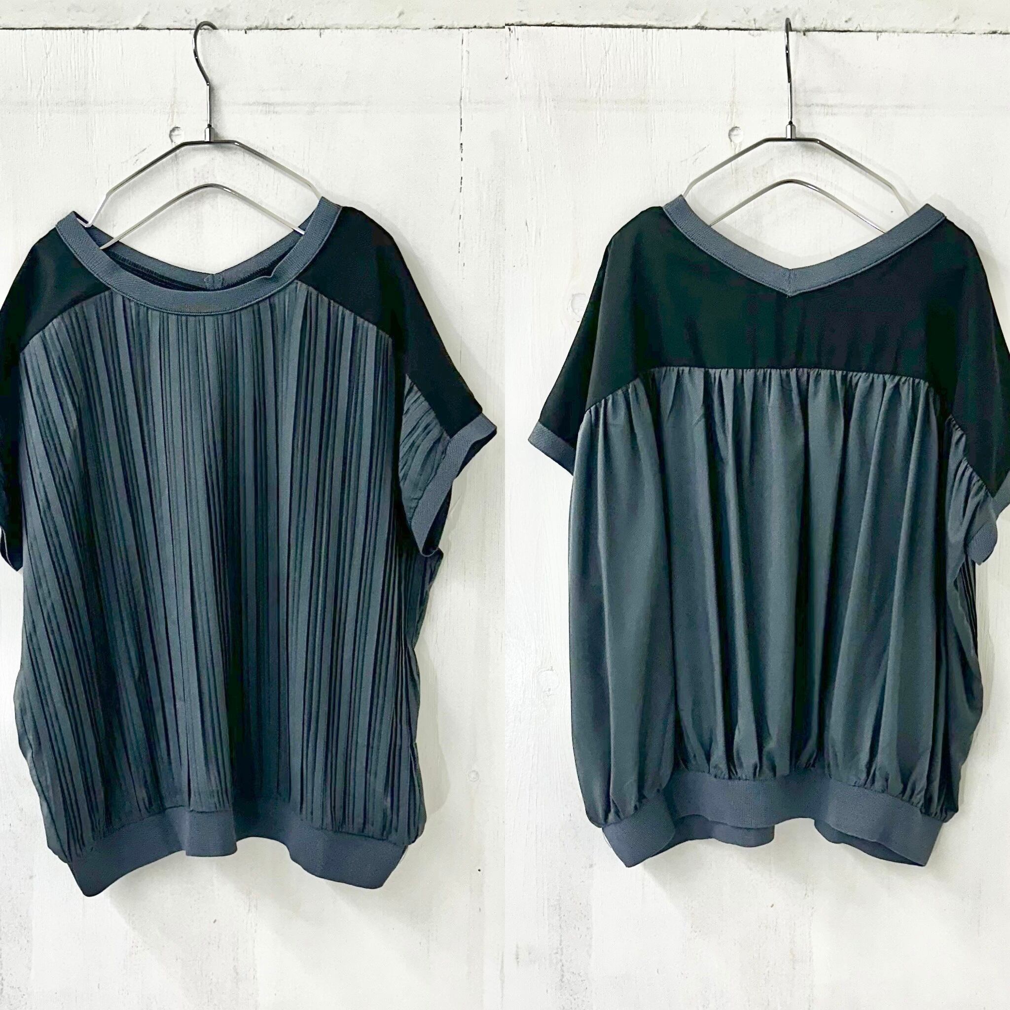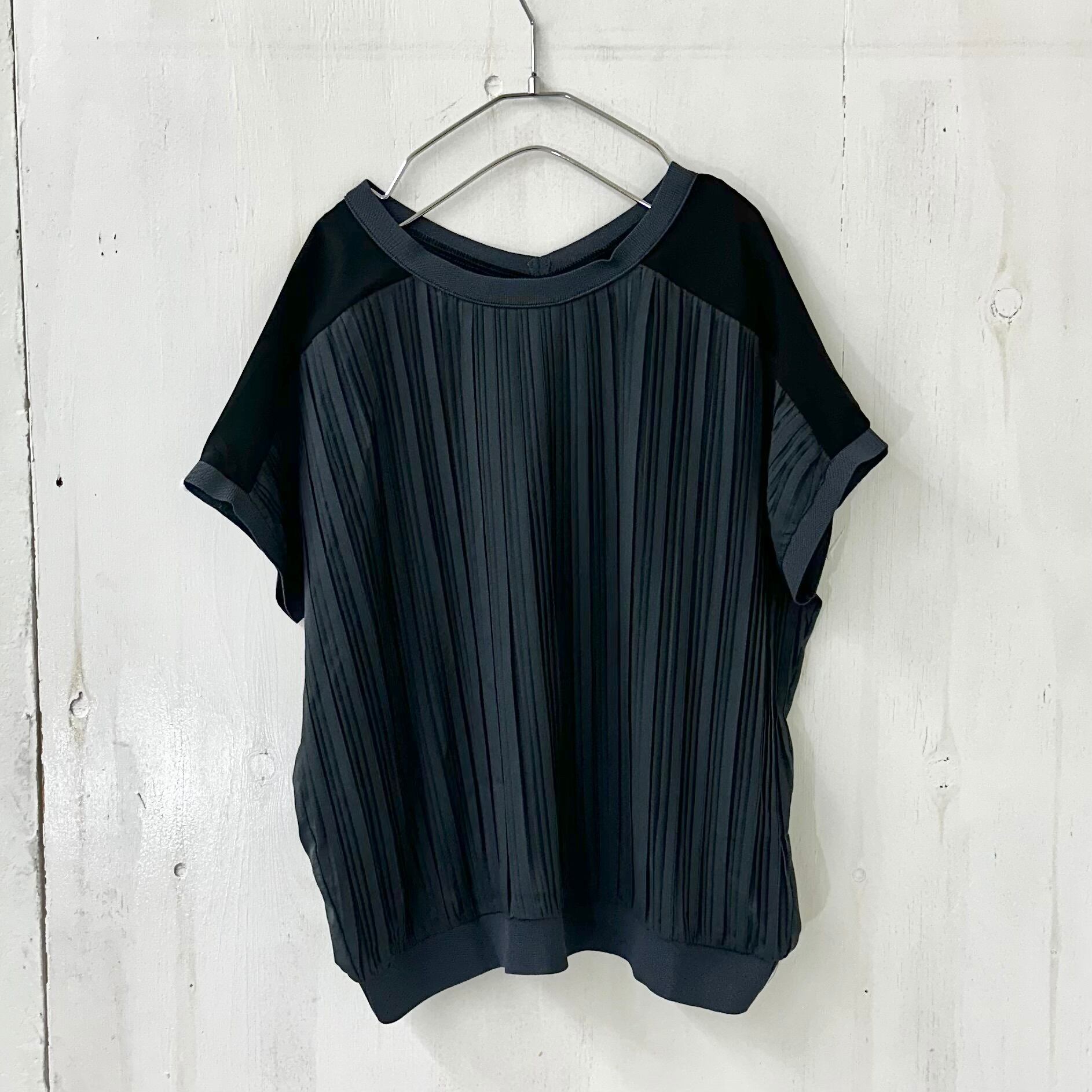 黒とチャコールのバイカラーで切替られたプリーツ ブラウスは