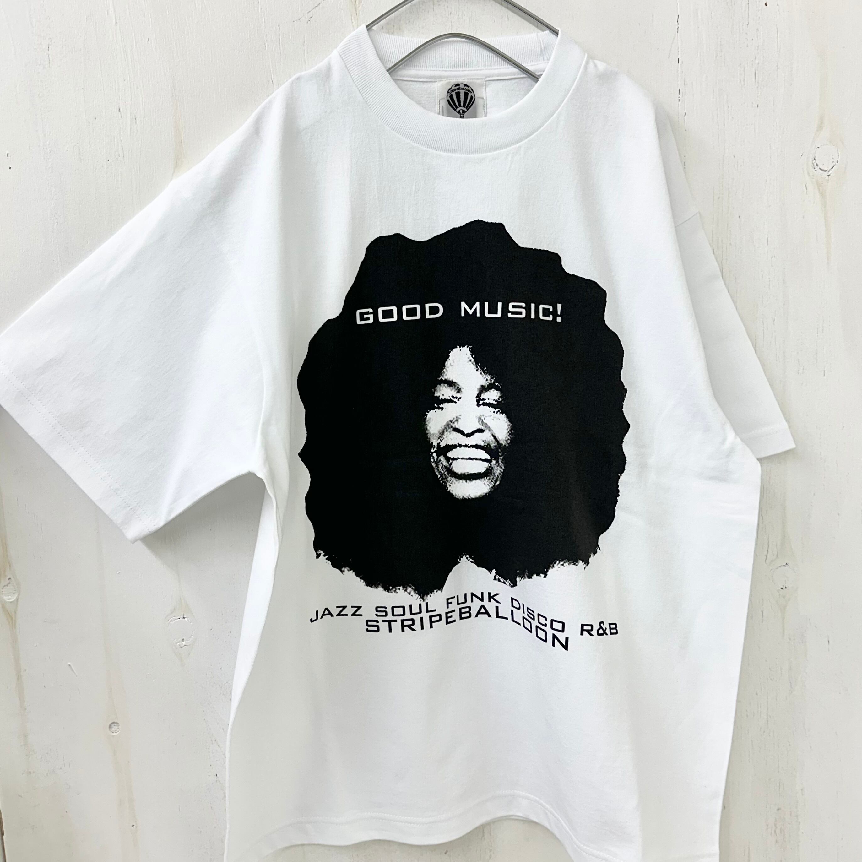 【STRIPE BALLOON】7.1oz オープン エンド ラギット TEE 『GOOD MUSIC』ホワイト X ブラック 染み込み