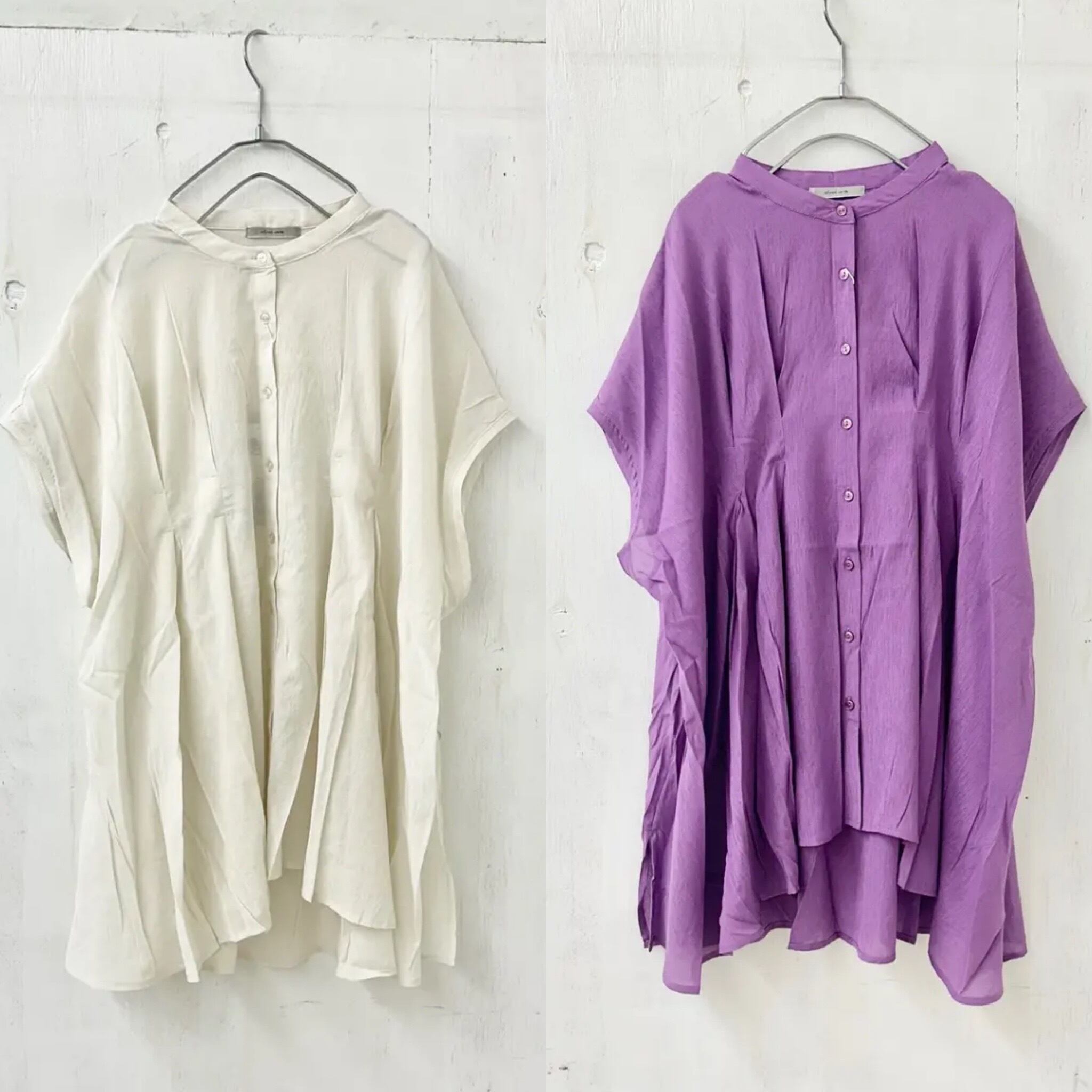 バンドカラーでワイドな肩落ちシルエットが可愛い。