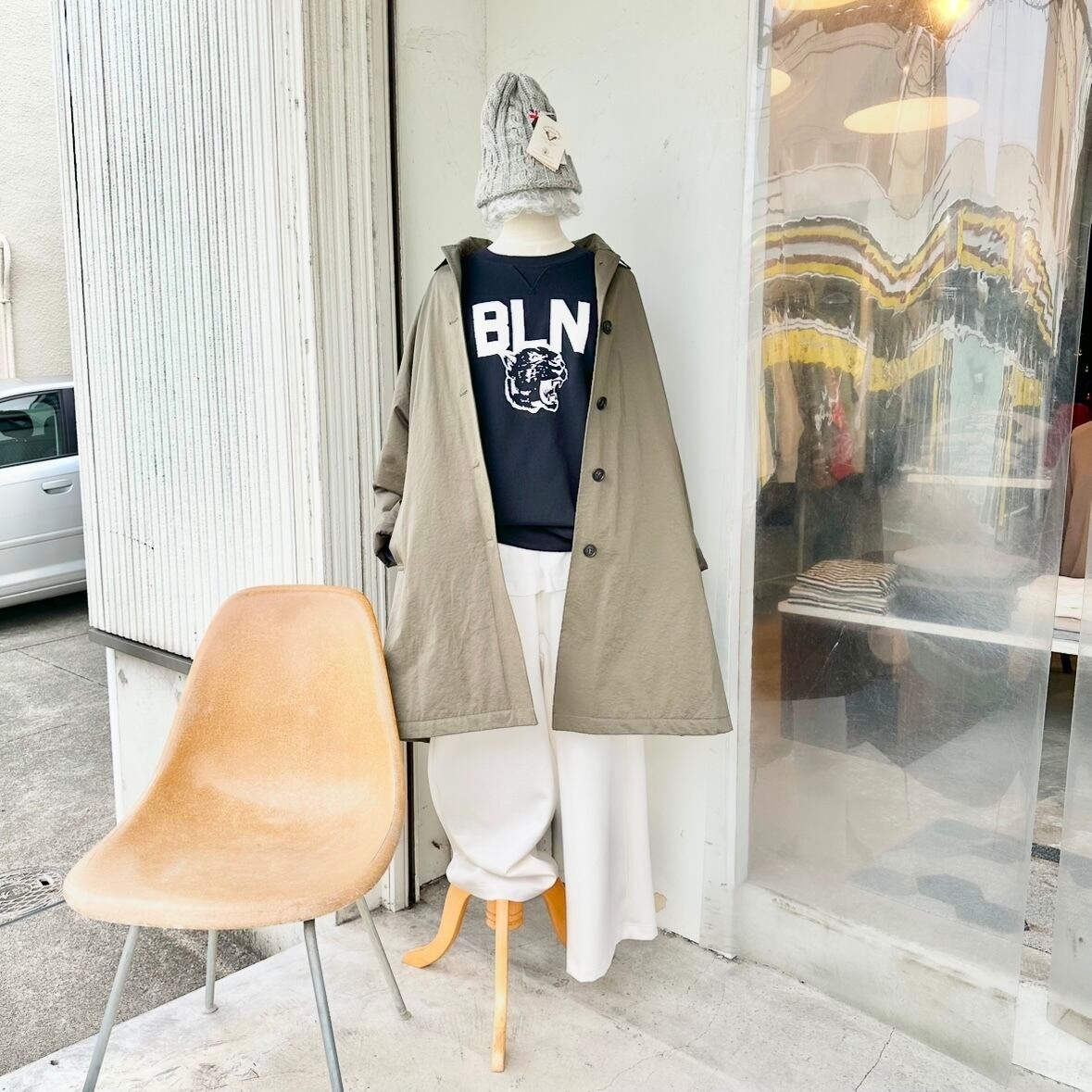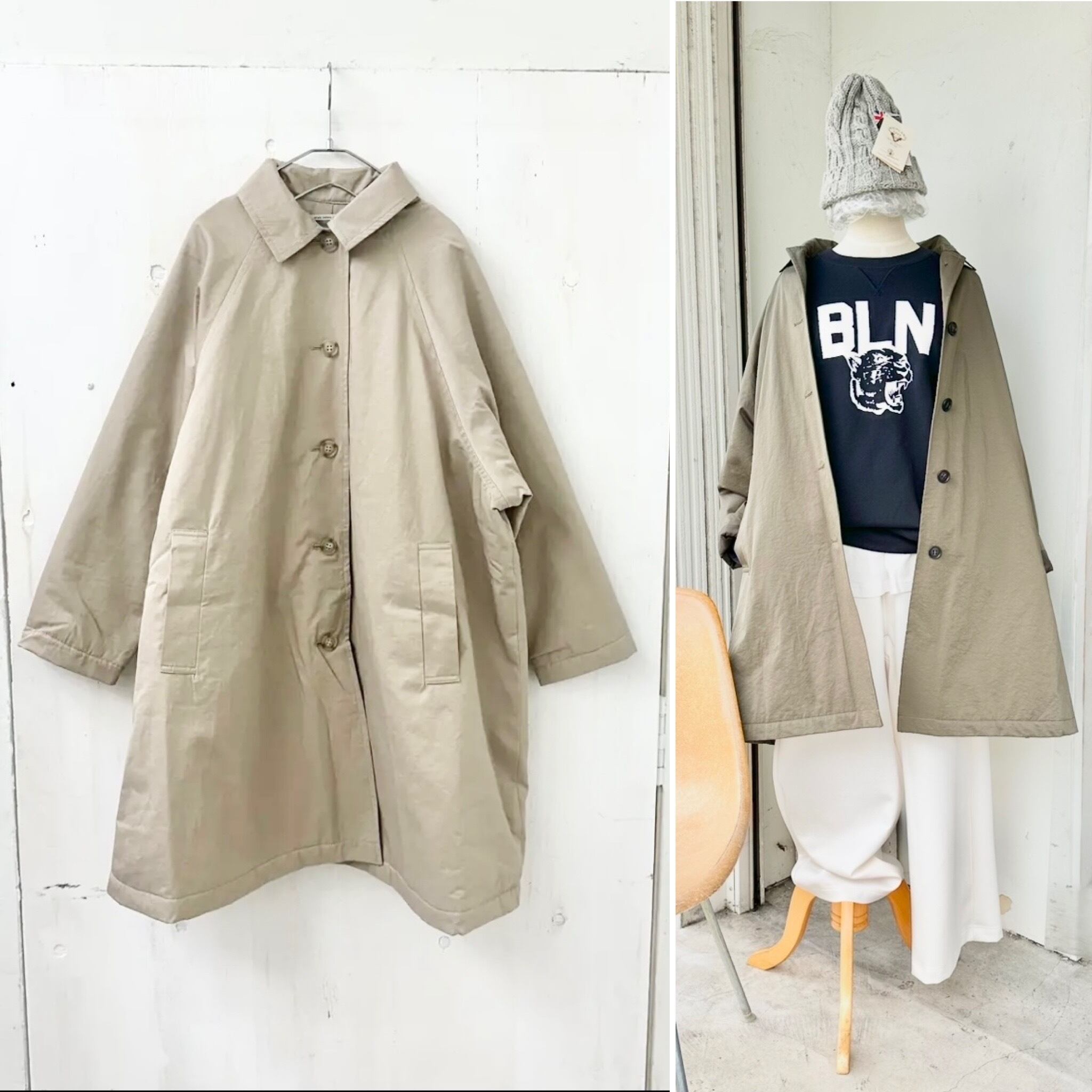 ゆったり肩落ちシルエットのステンカラーコートは