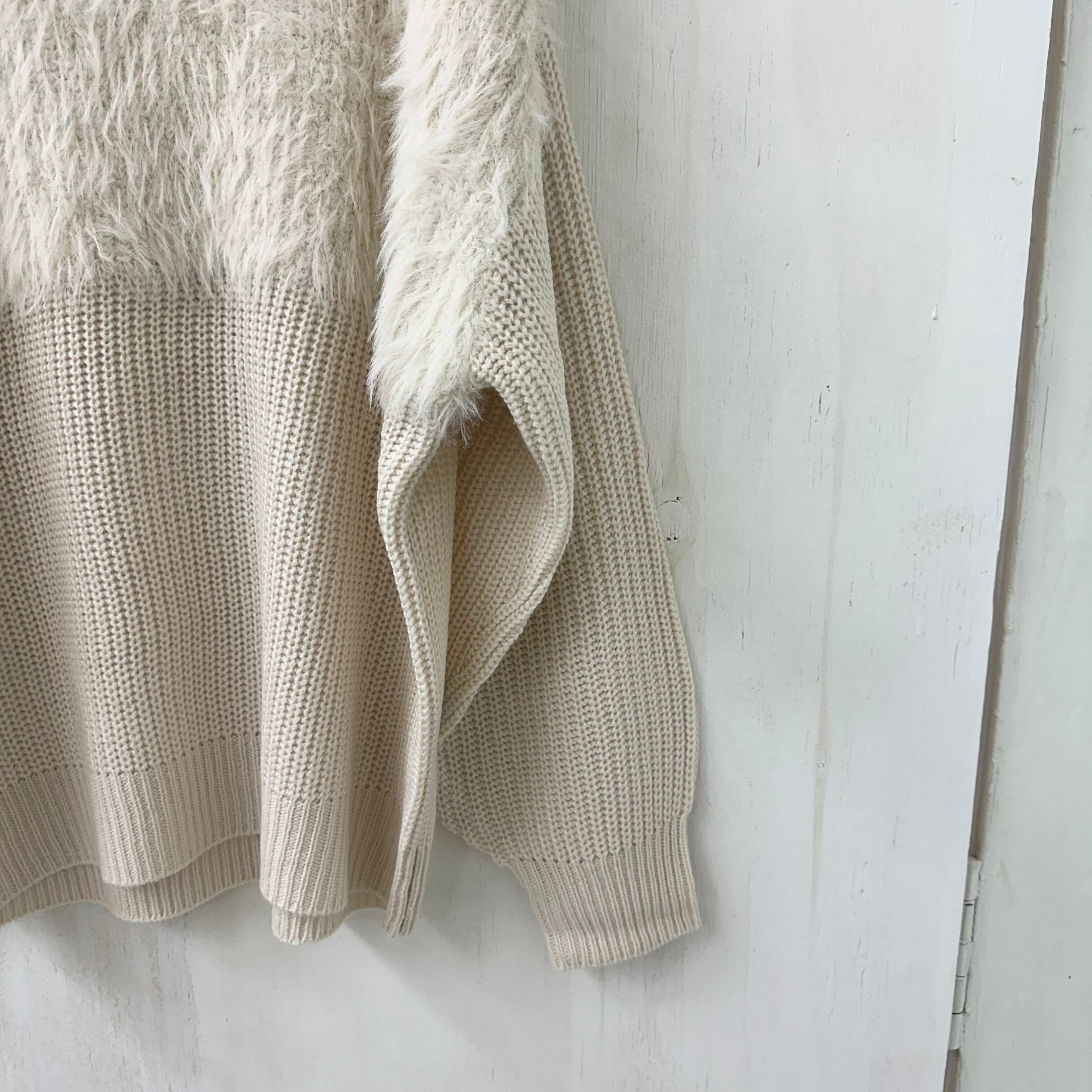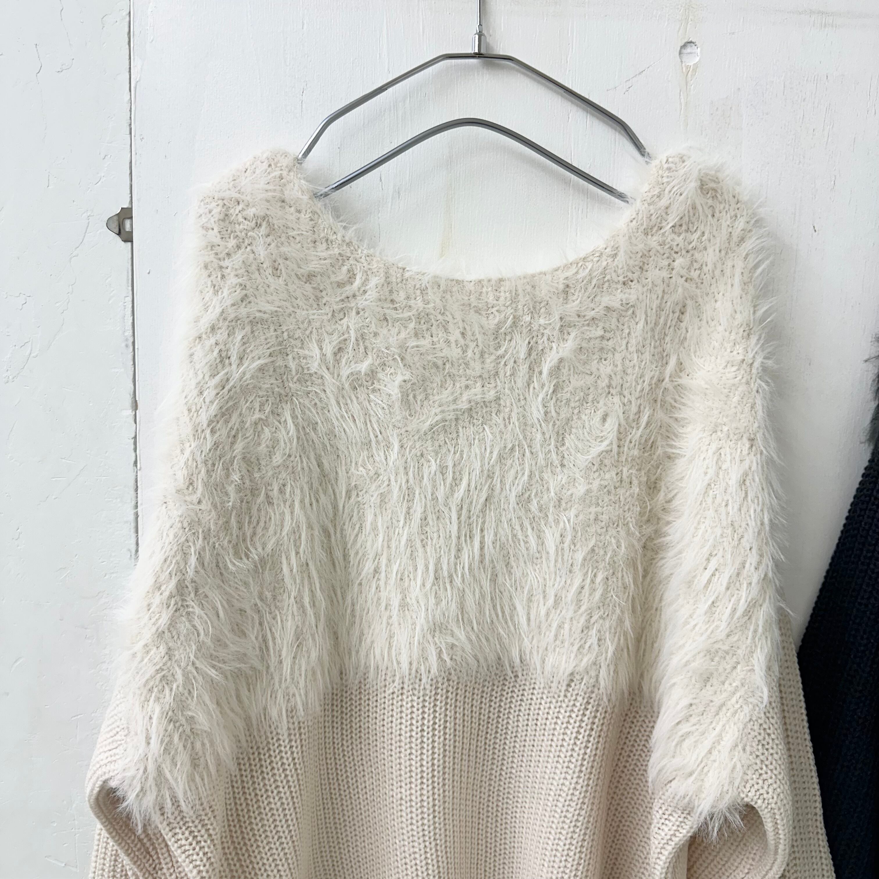 トップはふわふわのシャギー、袖と身頃下は片畔で切り替えた可愛らしいプルニット。ボートネック気味な首周りはスッキリ見えにも◎