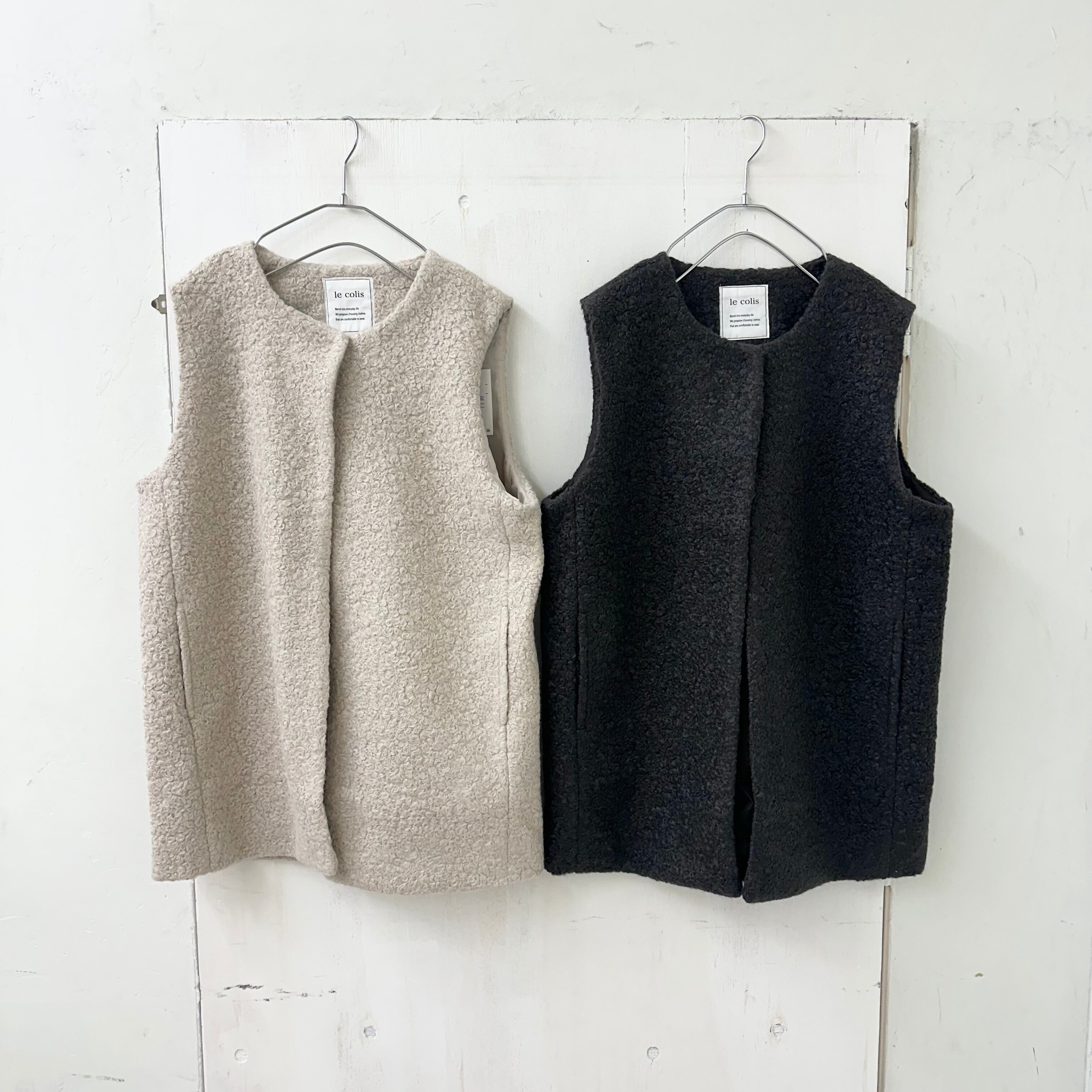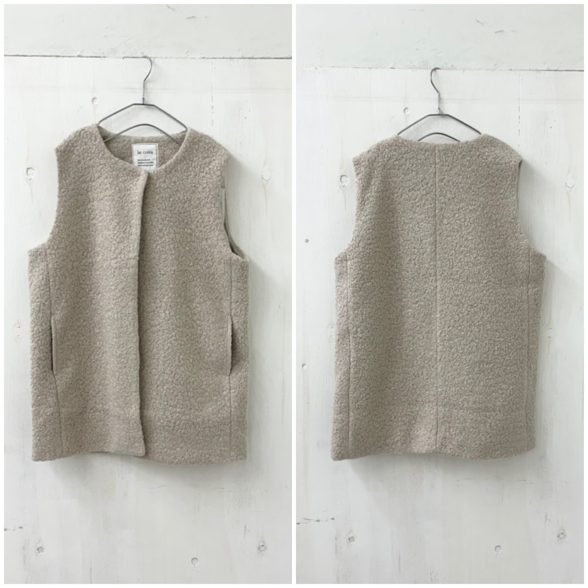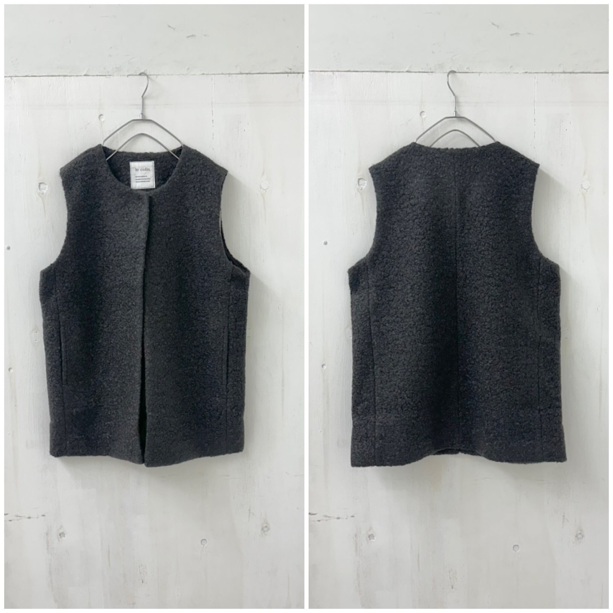 ブークレーのシンプルなロングベスト。スナップボタンが1つで、開けるとラフに、留めるとボックスシルエットな感じできちんと感もあります◎カットソーやシャツ、ワンピースにあわせて。