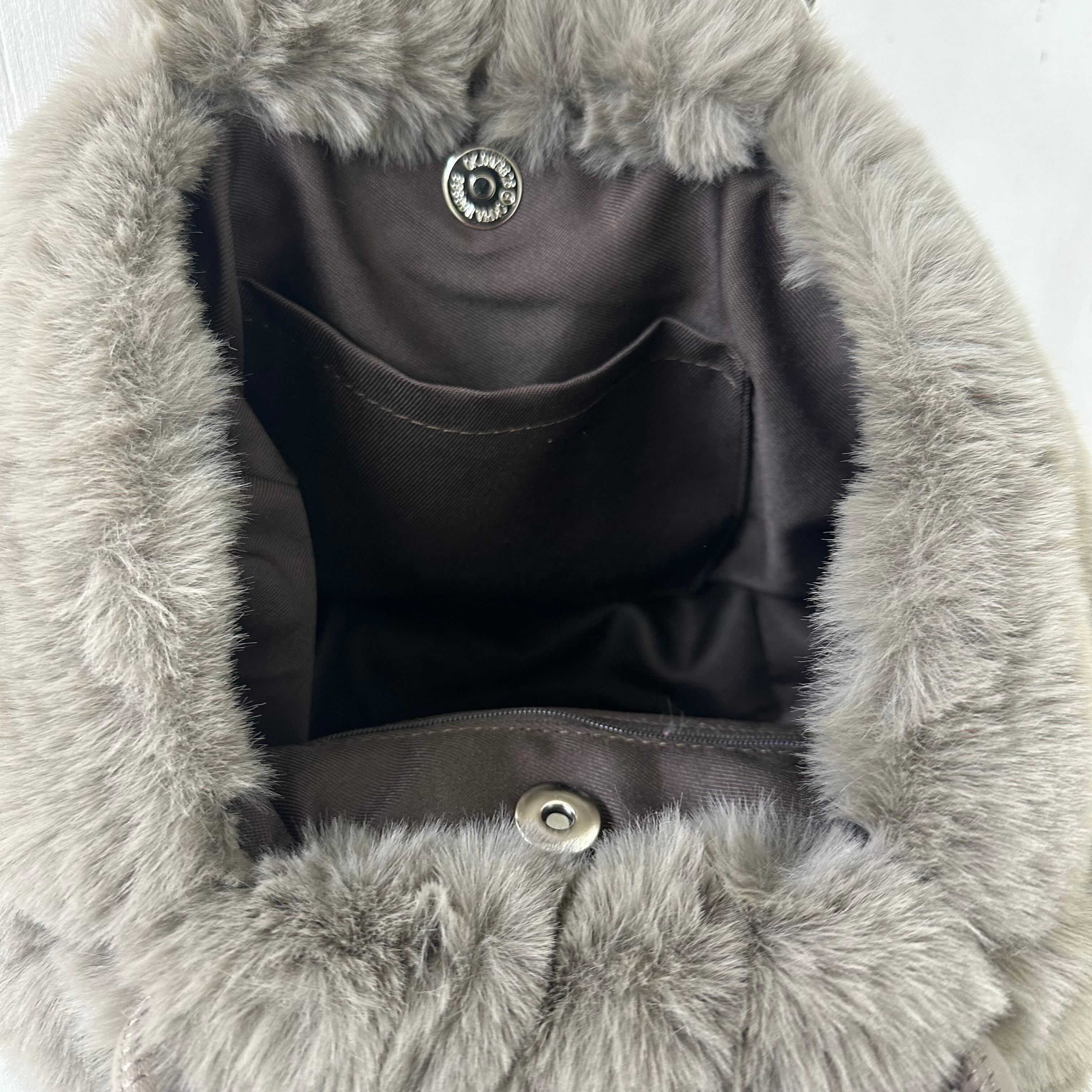 ECOレザーのアミアミハンドルとふわふわのファーが可愛いバッグ♡インにはオープンポケットとジップポケットが1つずつ付いています。開け口はマグネットボタンも付いて安心です。