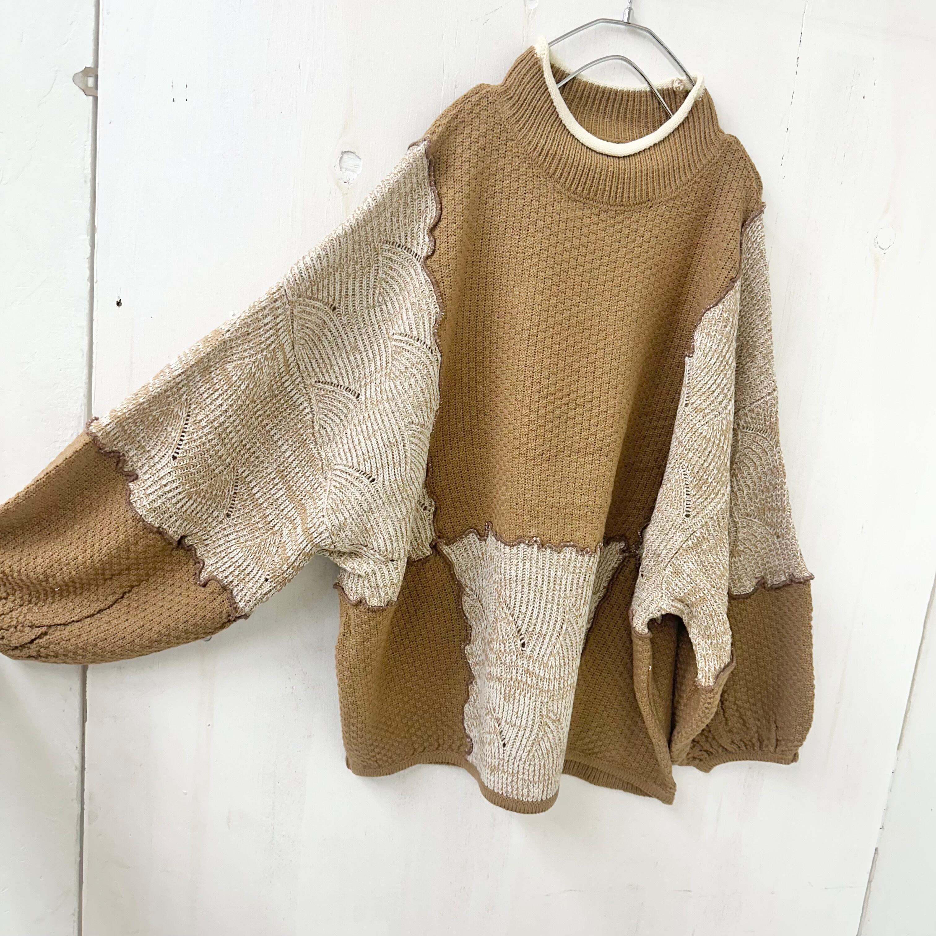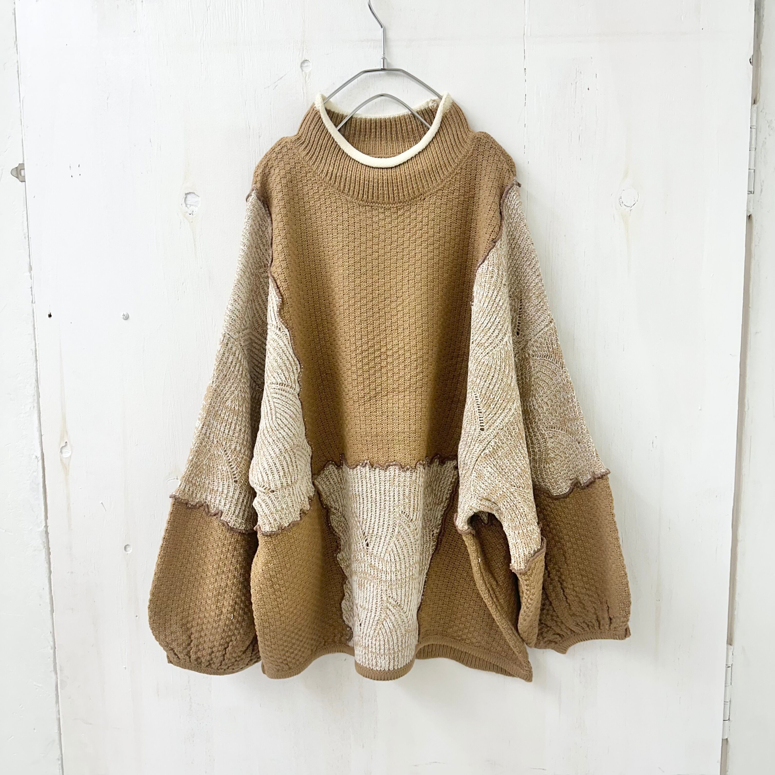 パッチワークライク ワイドスリーブ ボトルネック ニット