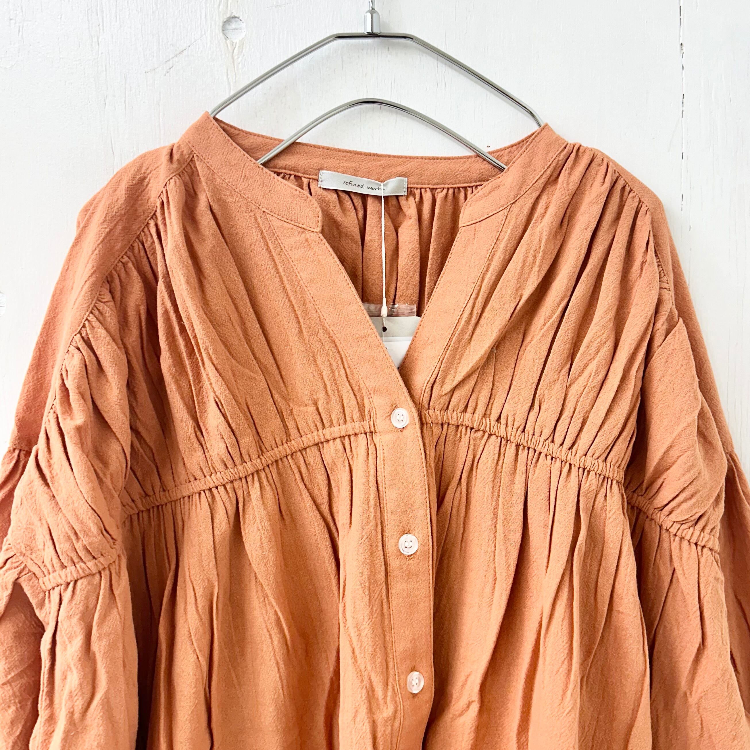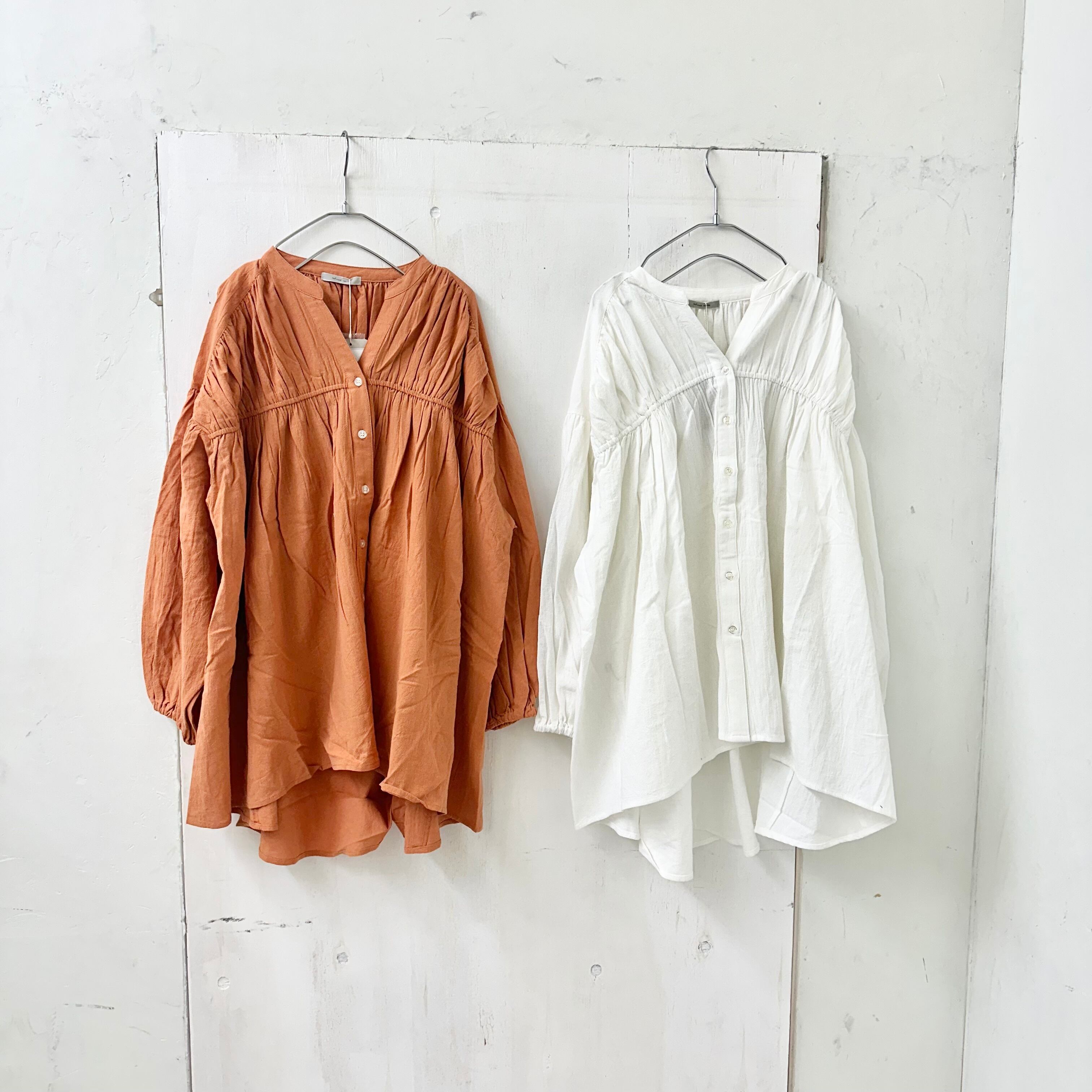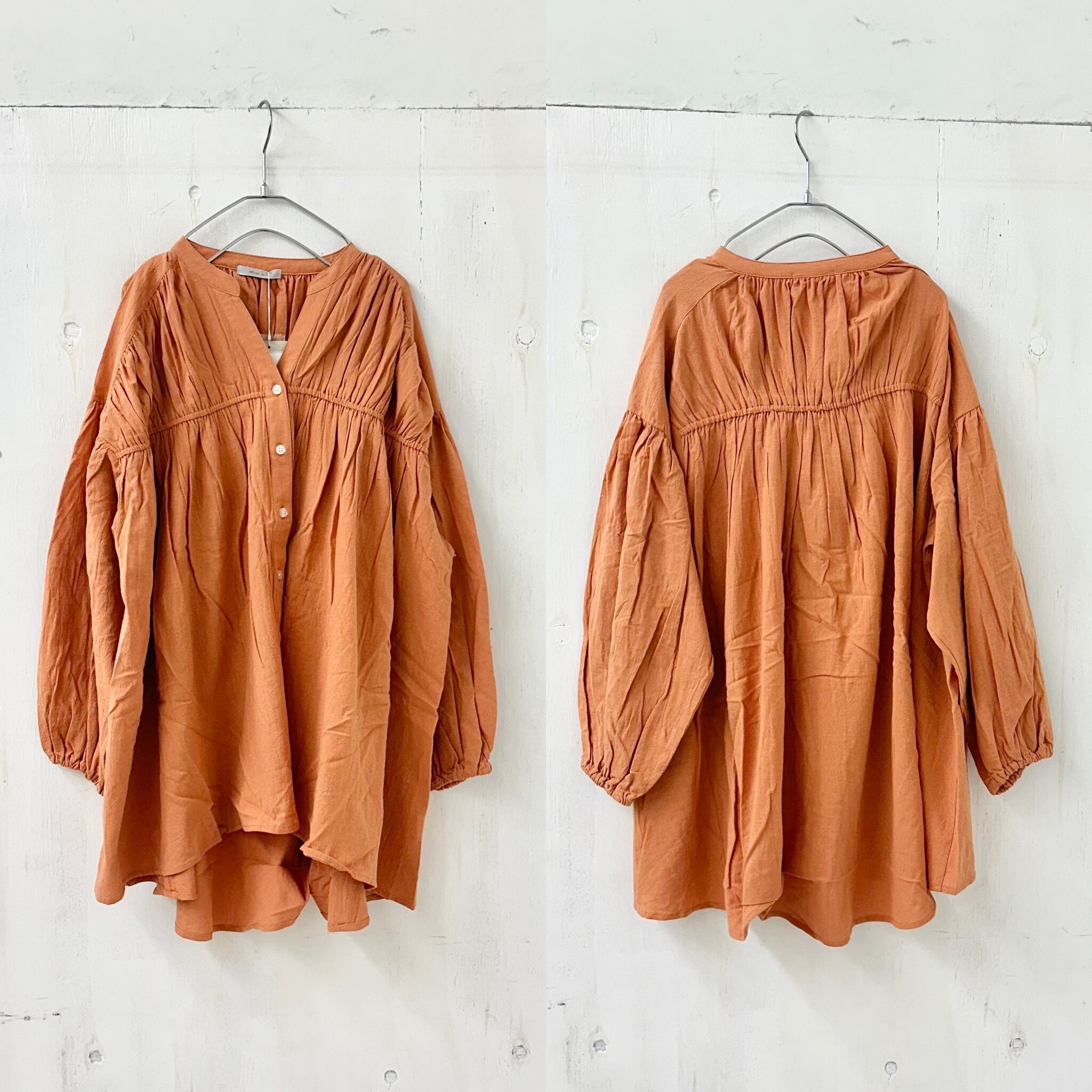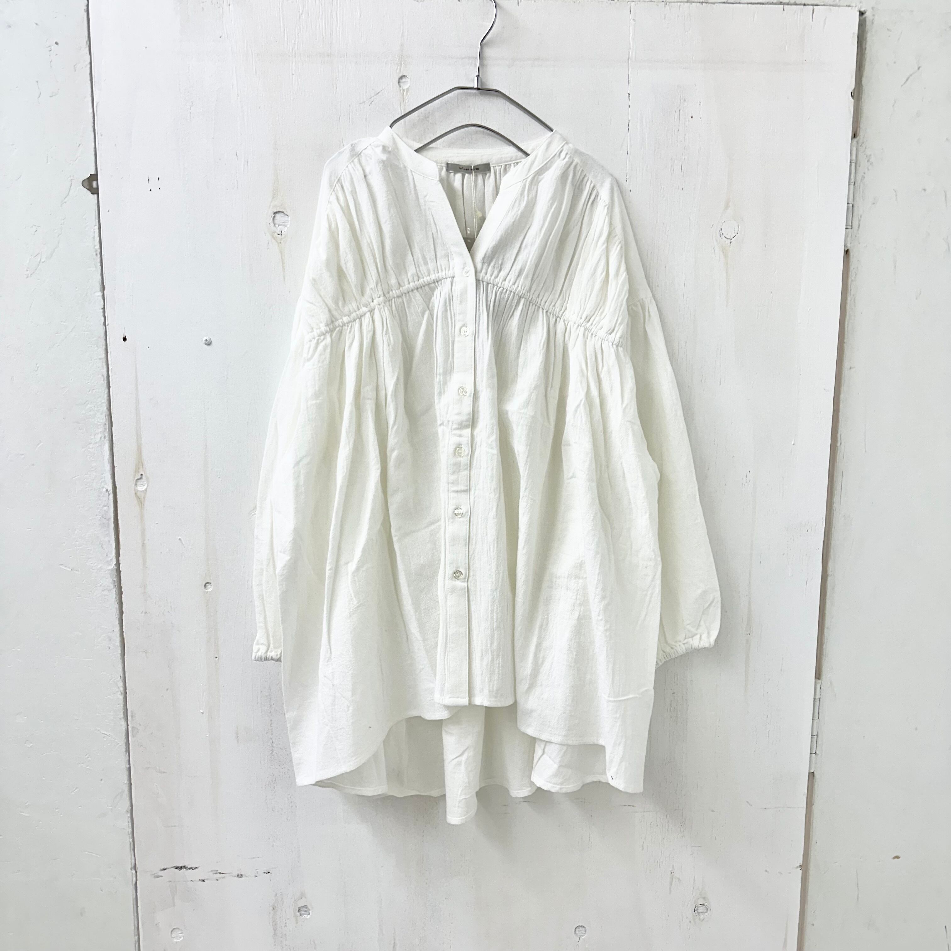 ウォッシャブル コットン バンド カラー ギャザー ワイド チュニック ブラウス